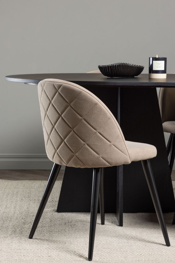 De eleganta Velvet Stitches-stolarna är klädda i beige polysterlinne och har en dekorativ dekorsöm och ett rutmönster på baksidan. Stolarnas mjukt stoppade sits och rundade ryggstöd erbjuder optimal komfort. Benen är lätt utsvängda och tillverkade av robust svart järn, vilket ger en modern touch.