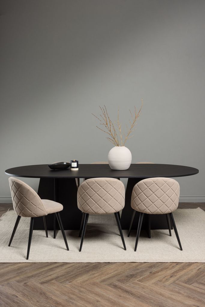 Upplev en perfekt kombination av stil och komfort med Venture Home Matgrupp Bootcut. Detta moderna set inkluderar ett ovalt matbord med en bordsskiva i svart MDF och faner, och en unik stomme med två konformade ben i öppen design. Bordet mäter 230x115 cm, vilket ger gott om plats för familjemiddagar och festliga tillställningar.