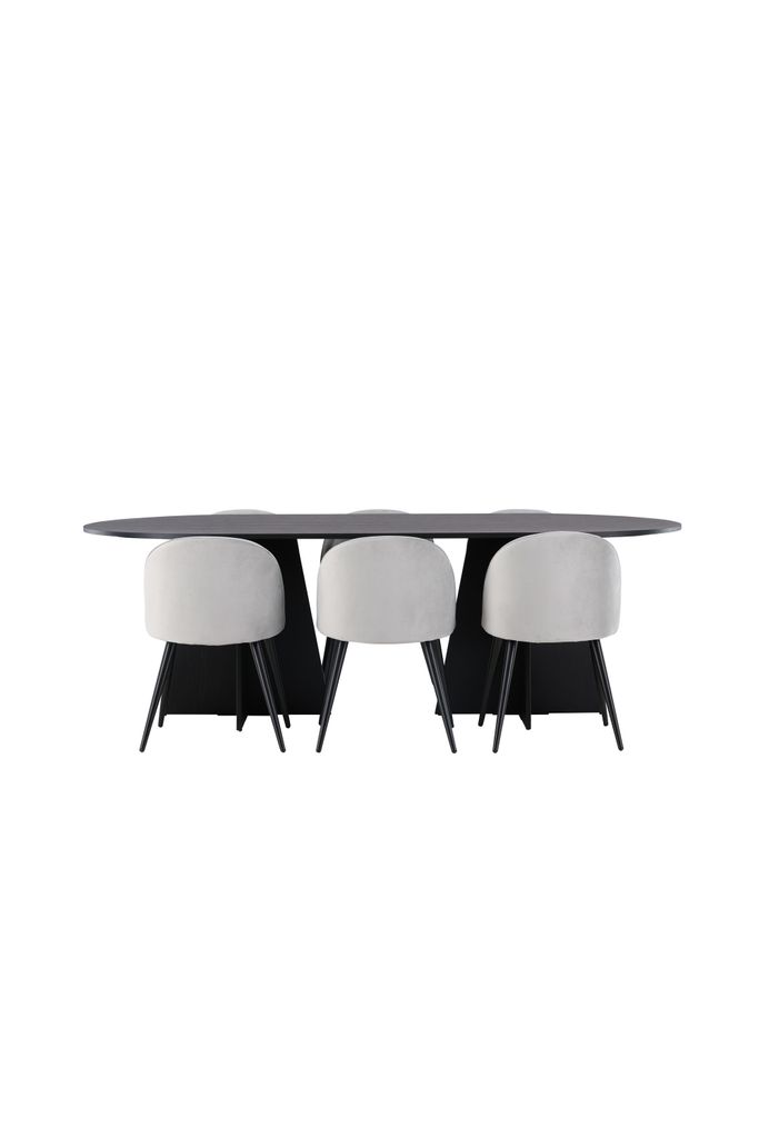 Elegant matgrupp med ovalt bord i svart faner och gråa sammetstolar. Perfekt för modern inredning.