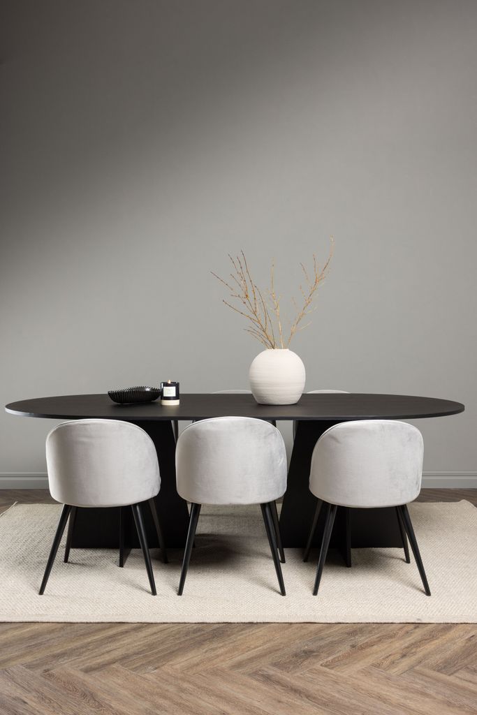 De medföljande stolarna från Velvet-serien erbjuder en helklädd design i mjukt grått sammetstyg, vilket ger en inbjudande och bekväm sittupplevelse. De svart pulverlackerade metallbenen kompletterar bordets stilrena look, medan den rundade ryggen och sitsen med mjuk stoppning säkerställer hög komfort under långa middagar.
