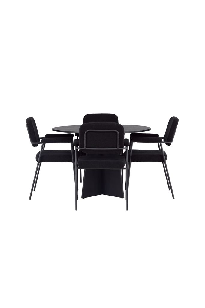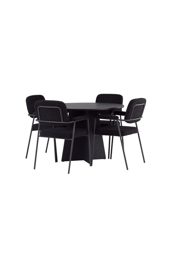 Elegant matgrupp i sotig svart med rund bordsskiva och skandinaviska stolar, perfekt för både kök och vardagsrum.