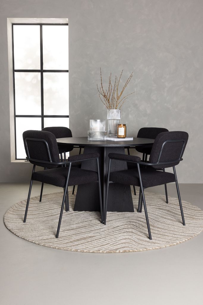 För en komplett matgrupp ingår de skandinaviska stolarna från serien Yesterday. Dessa stolar har en helklädd sits i mjukt svart bouclétyg och smala metallben som integrerar armstöd i samma färg, vilket ger både komfort och stil. Den mjuka stoppningen garanterar långa och trivsamma måltider med familj och vänner.