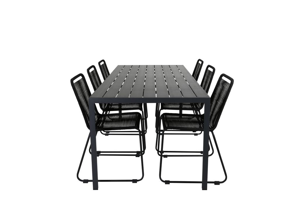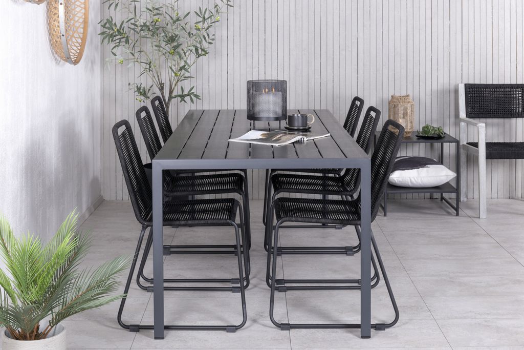 Upptäck Venture Home Matgrupp Break med Stolar Lindos, en perfekt kombination av klassisk design och modern stil som förhöjer vilken uteplats som helst. Matbordet Break, i en elegant svart färg, matchas med de stilrena stolarna från serien Lindos för att skapa en inbjudande atmosfär.