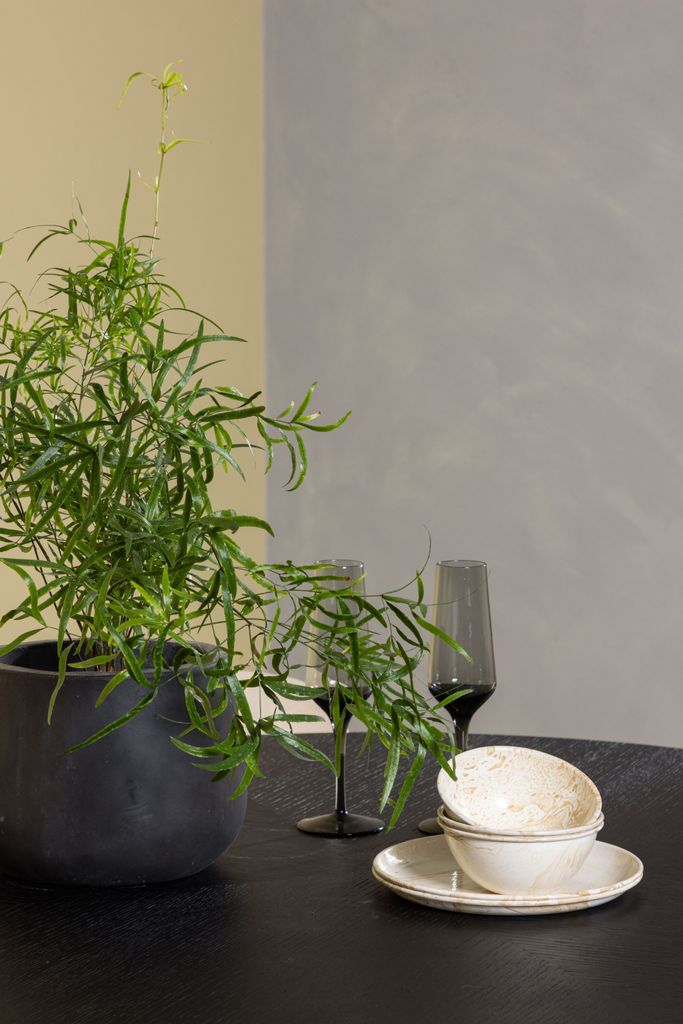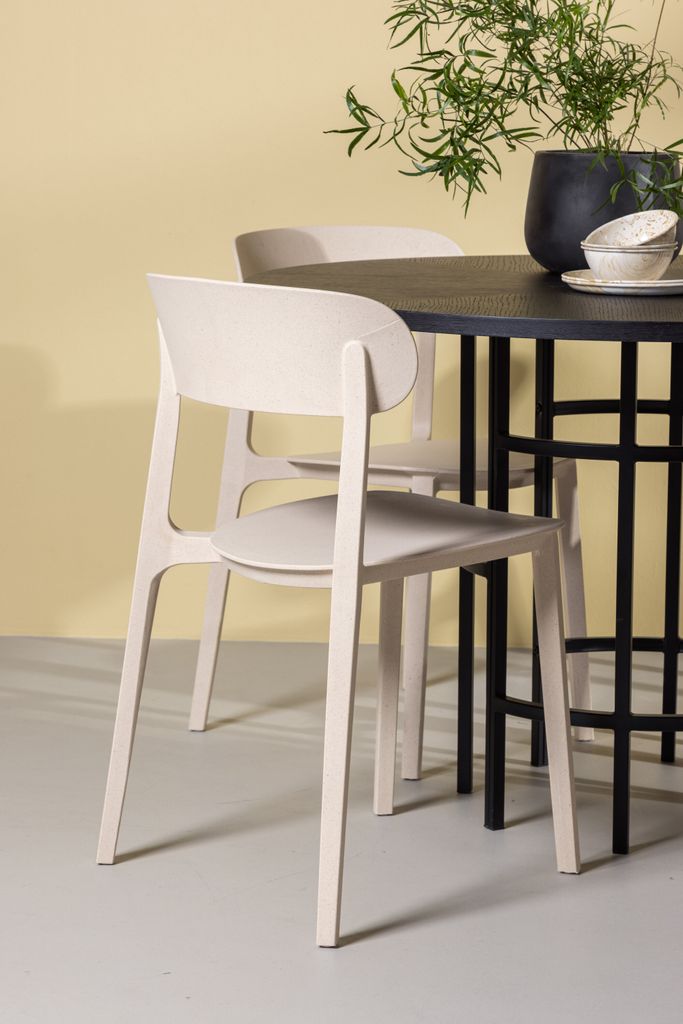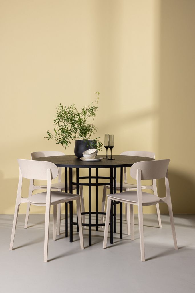 Stolarnas luftiga utformning och nordiskt raka linjer kompletterar bordets eleganta design, vilket skapar en harmonisk och inbjudande atmosfär i ditt matrum. Bordets mått är 115 cm, perfekt för familjemiddagar och sociala tillställningar.