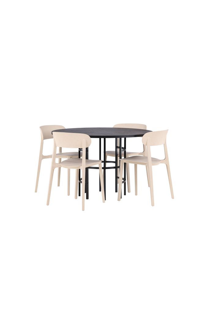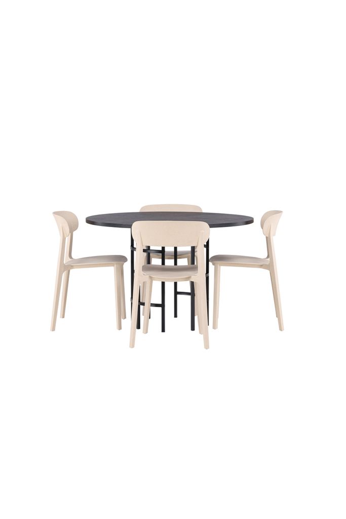 Utforska den stilrena Venture Home Matgrupp Copenhagen, designad för att förhöja hemmets hjärta. Det runda matbordet har en elegant svart bordsskiva i MDF som vilar på ett dekorativt cylinderformat underrede i svart metall, vilket ger en industriell touch. Kombinerat med fyra Åstol stolar, skapade i en behaglig ljusputsad kulör av träkomposit, är detta set ett utmärkt val för det moderna hemmet.
