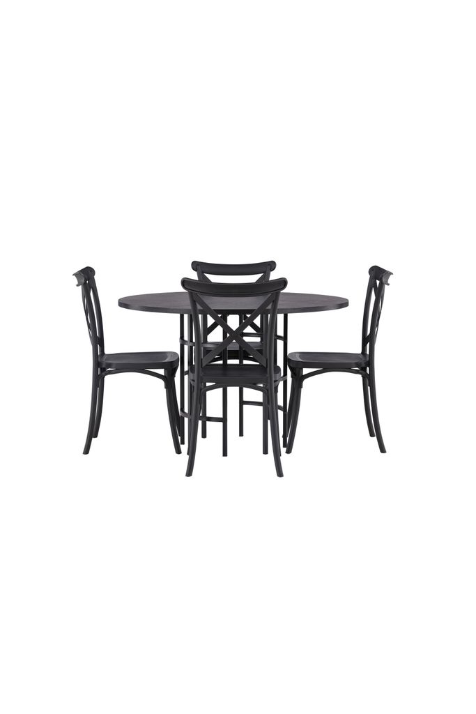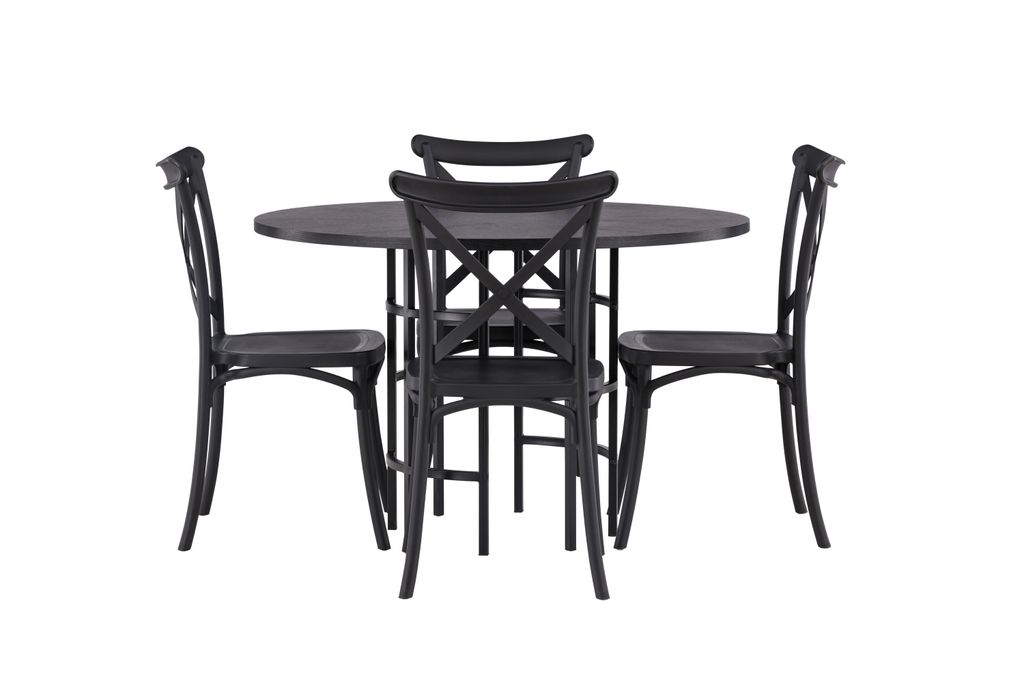 Tillsammans med bordet kommer fyra matstolar från Crosett-serien. Stolarna är tillverkade i hållbar plast med en matt svart kulör som står sig över tid. Dess ergonomiska design ger komfort under långa middagar. Denna matgrupp är perfekt för både vardag och fest.