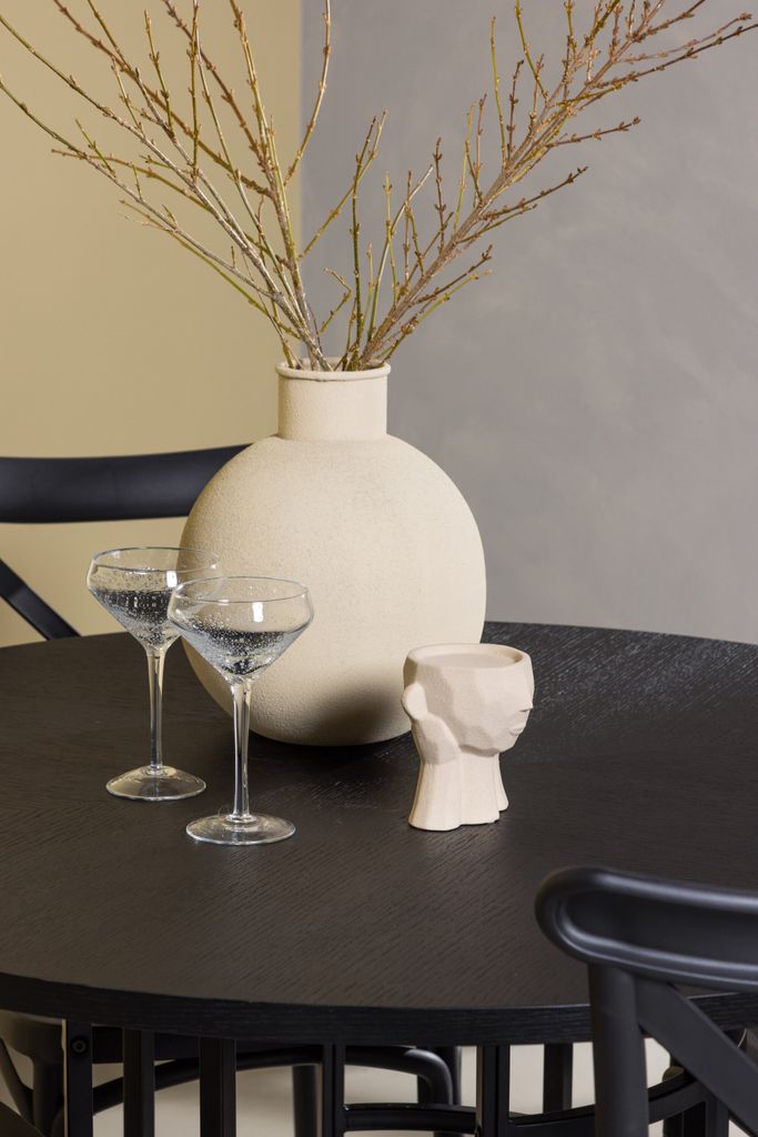 Den industriella designen hos Venture Home Matgrupp Copenhagen ger ditt hem en modern och stilren känsla. Matbordet har en rund svart bordsskiva i MDF, vilket ger ett elegant intryck och enkel rengöring. Det cylinderformade underredet i svart metall ger stabilitet och kompletterar den moderna estetiken.