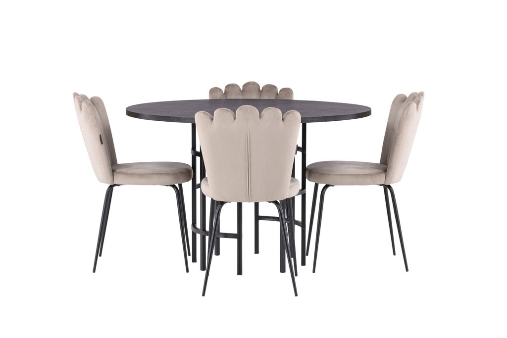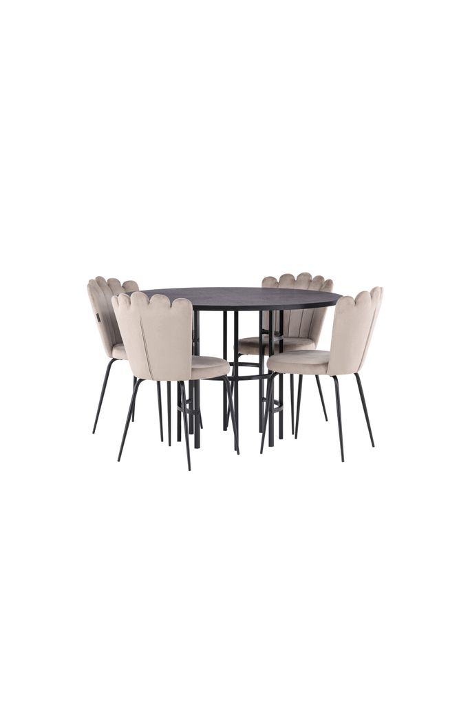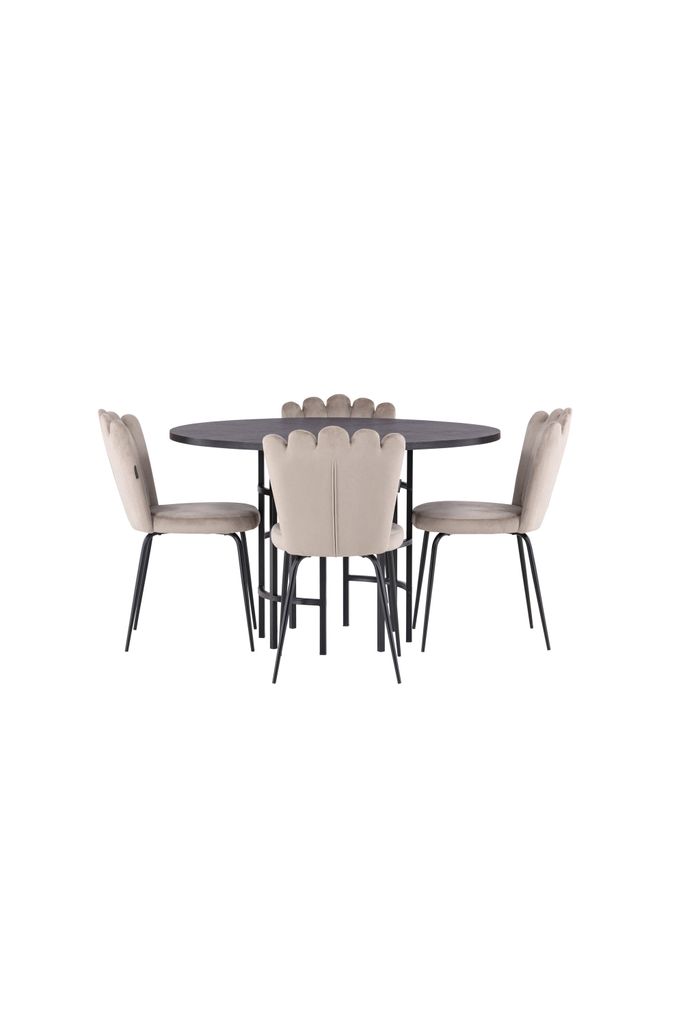Ge ditt matrum en modern och stilren känsla med Venture Home Matgrupp Copenhagen, komplett med fyra matstolar från serien Limhamn. Det runda bordet har en svart bordsskiva i robust MDF och ett dekorativt cylindriskt underrede i svart metall, vilket ger en elegant och tidlös look. Bordet mäter 115 cm i diameter, perfekt för familjesammankomster eller middagar med vänner.