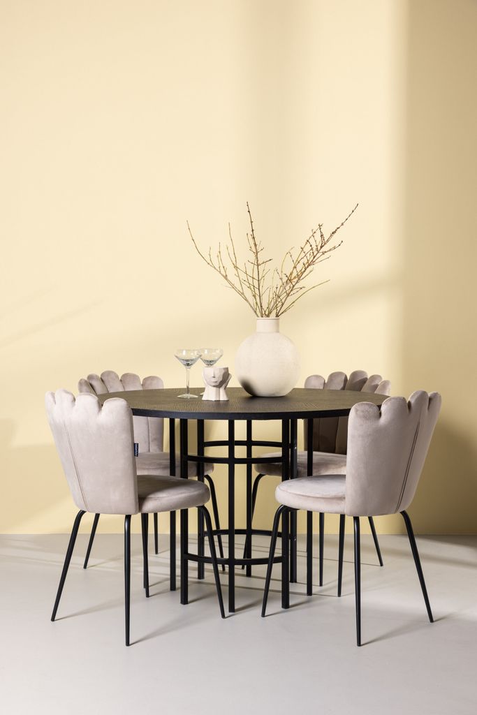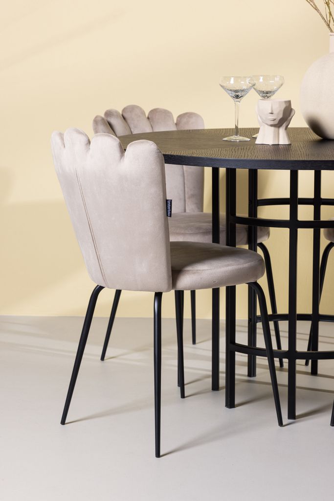 De medföljande Limhamn-stolarna har en inbjudande design med en snäckformad rygg som pryds av dekorativa sömmar. Stolarna är klädda i smakfullt beige sammetstyg som ger en lyxig känsla. De svarta, pulverlackerade metallbenen bidrar till en stabil och hållbar konstruktion.