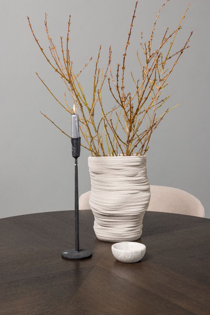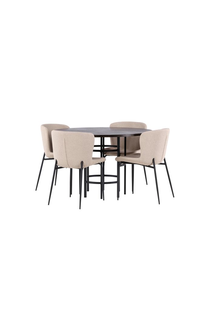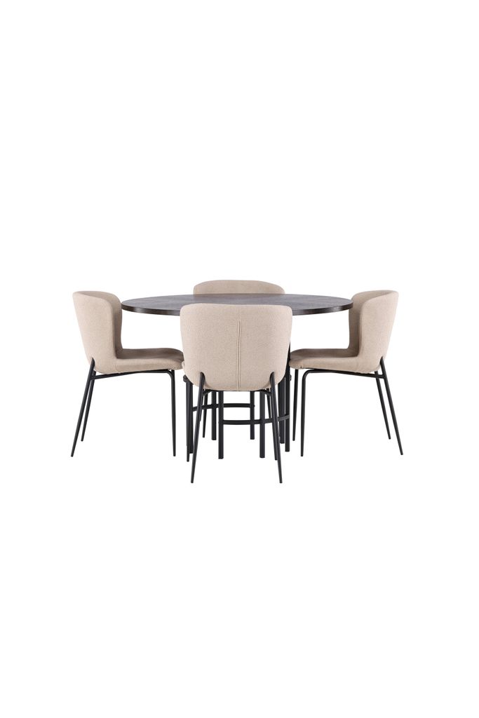 De fyra medföljande Modesto-stolarna är helklädda i ett beige lurvigt tyg som kombinerar komfort och stil. De smala, svarta metallbenen ger en elegant kontrast till stolen samtidigt som de säkerställer hållbarhet och stabilitet. Den lätt rundade ryggen och den stoppade sittdynan förhöjer sittkomforten, vilket förlänger de trivsamma stunderna kring bordet.