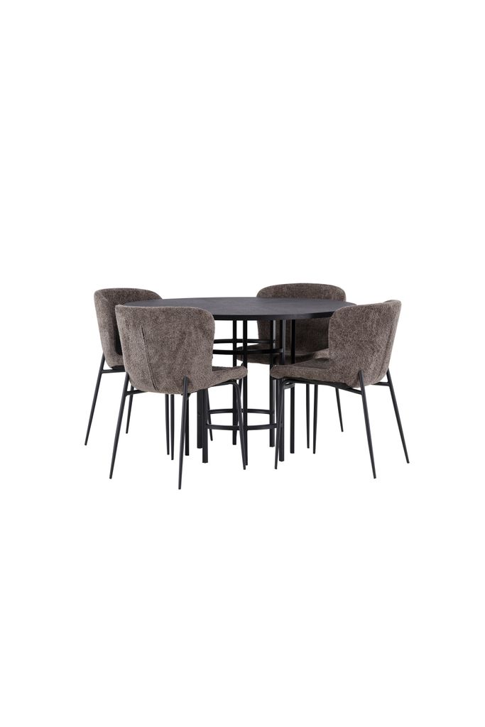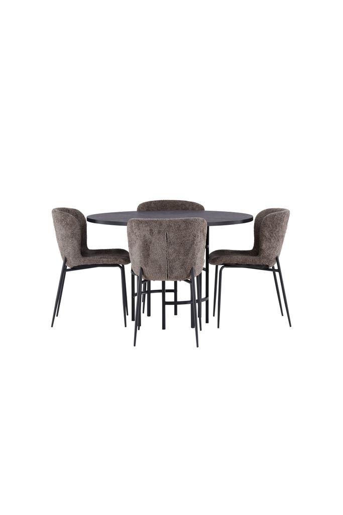 Elegant matgrupp med rund bordsskiva i svart MDF och bekväma stolar i beige lurvigt tyg. Perfekt för stilrena, trivsamma måltider.