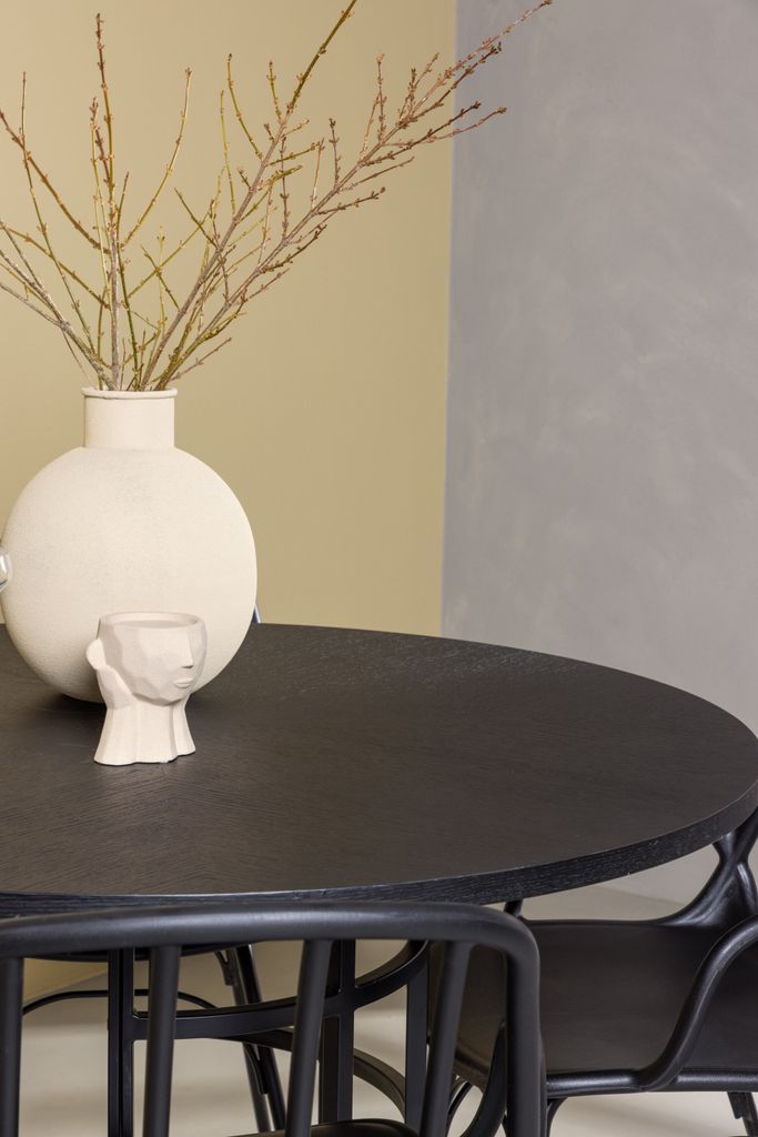 Upptäck elegansen i Venture Home Matgrupp Copenhagen, en perfekt kombination av stil och funktionalitet. Denna grupp inkluderar ett runt bord med en svart bordsskiva i högkvalitativ MDF och ett cylinderformat underrede i svart metall, vilket ger en modern och sofistikerad känsla.