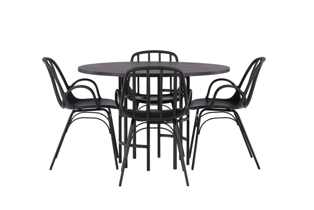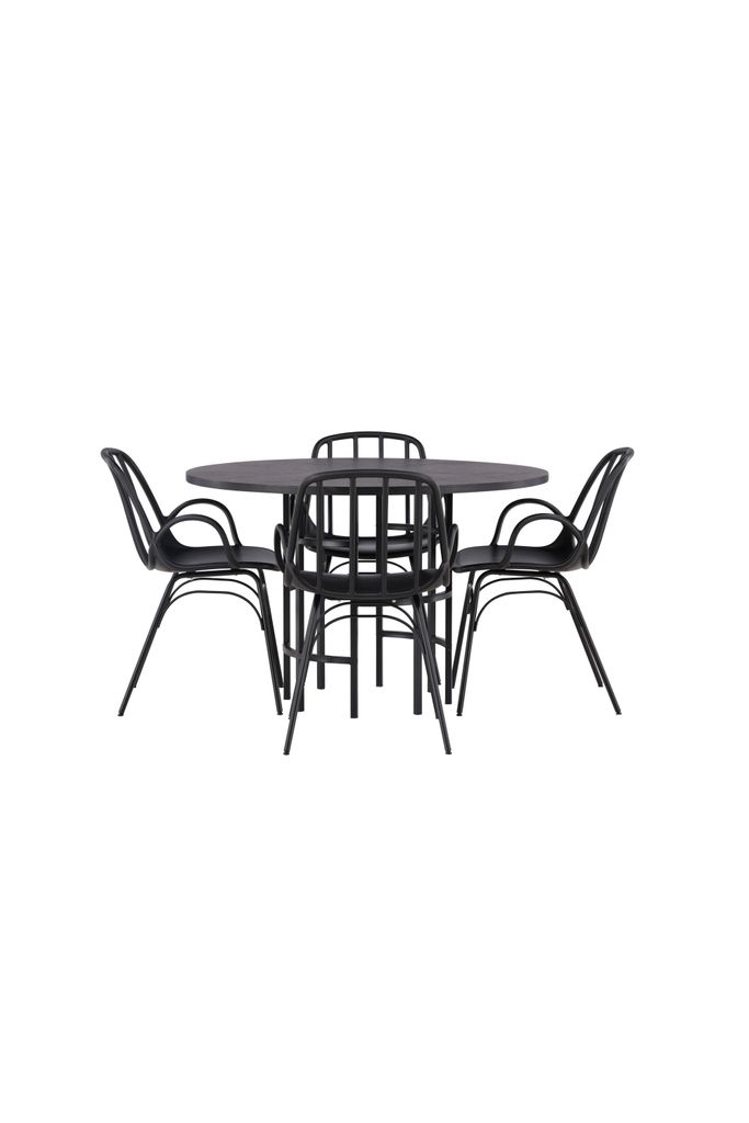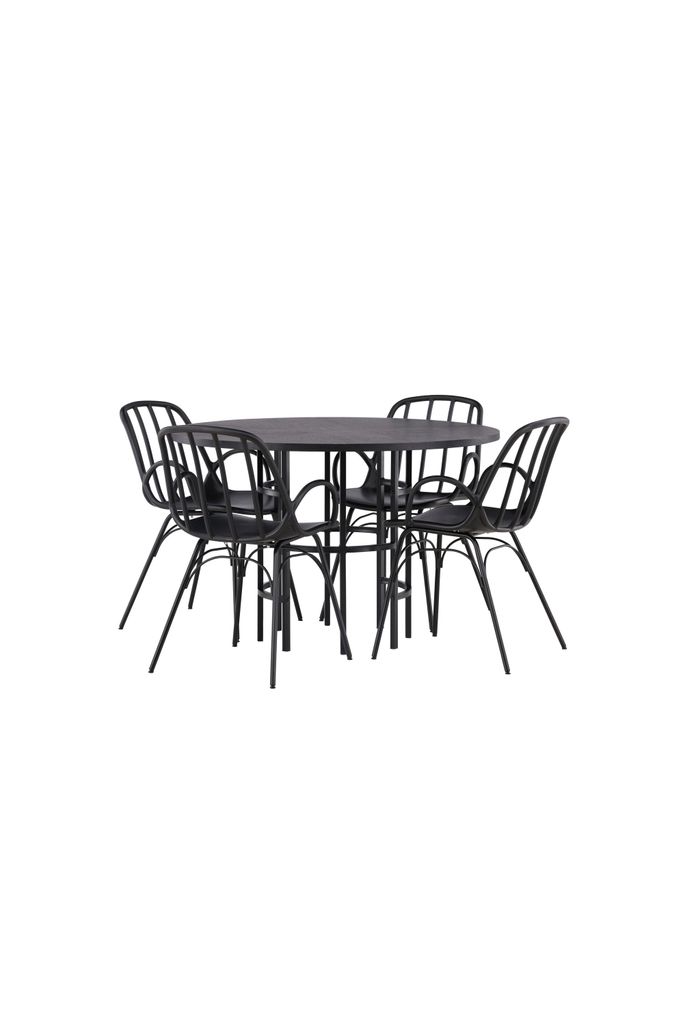 Kompletterad med de stilrena Dyrön-stolarna, tillverkade i svart plast och stål, erbjuder denna matgrupp både komfort och stil. Stolarna har integrerade armstöd och en ribbad design i den lätt rundade ryggen, vilket gör dem både eleganta och ergonomiska. De smala, lätt utsvängda benen ger en minimalistisk skandinavisk touch.