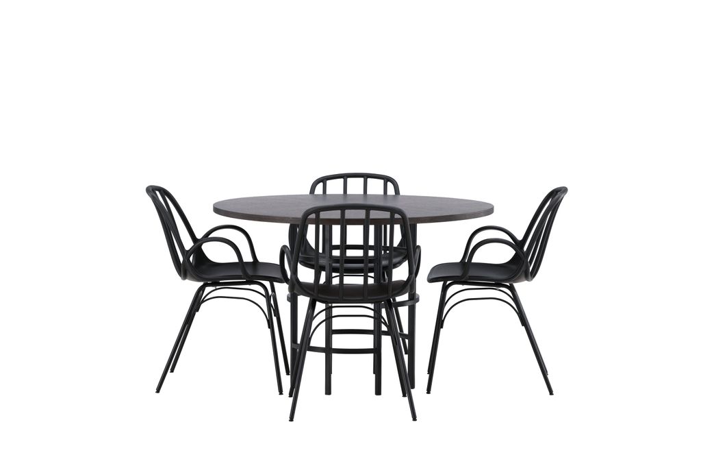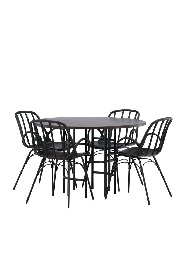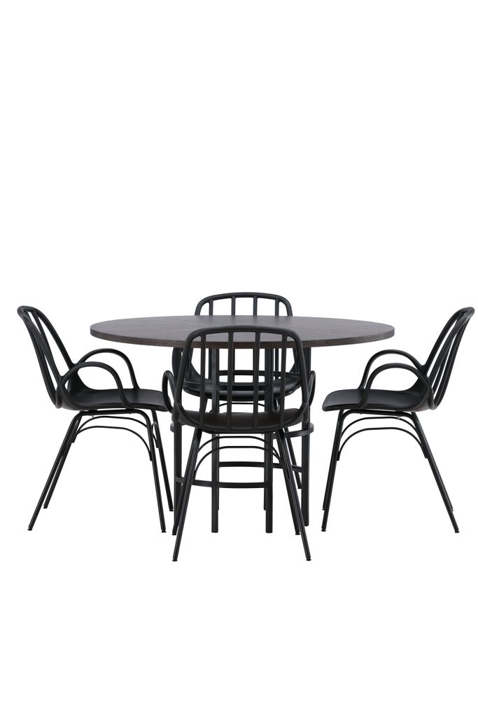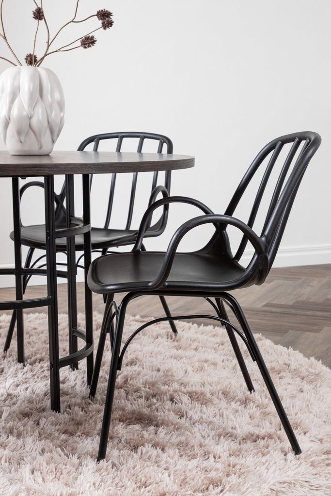 Skapa en inbjudande och modern atmosfär i ditt hem med Venture Home Matgrupp Copenhagen, komplett med stilrena Dyrön-stolar. Den svarta bordsskivan, tillverkad av elegant MDF, ger en sofistikerad känsla, medan det cylinderformade underredet i svart metall tillför en unik design. De medföljande Dyrön-stolarna är både praktiska och estetiskt tilltalande med sin svart plast- och stålkonstruktion. Deras integrerade armstöd och ribbade ryggdesign kombinerar komfort med stil. Perfekt för sociala sammanhang, den runda formen uppmuntrar till samtal och gemenskap.
