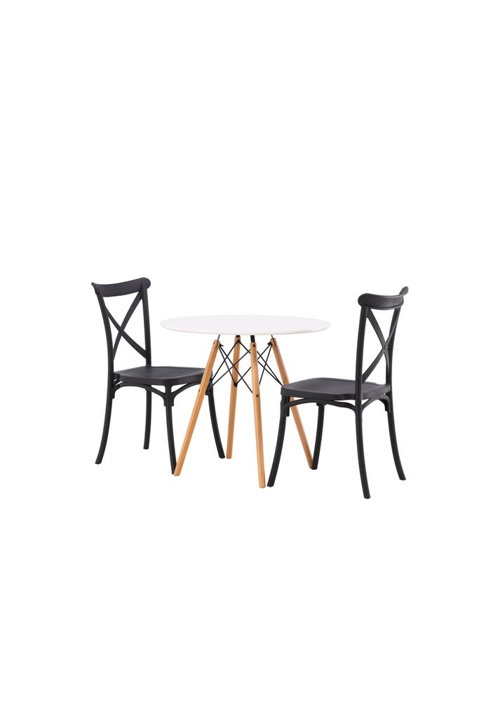 De medföljande matstolarna Crosett är robusta och praktiska, tillverkade i hållbar plast med en matt svart finish. Den genomtänkta designen med ett korsmönster på ryggen skapar ett stilrent och tidlöst utseende.