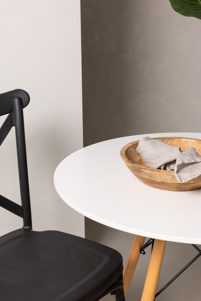 Det runda matbordet har en diameter på 60 cm och är tillverkat av vit MDF med lätt utsvängda ben i bokträ. De dekorativa detaljerna i svart stål ger bordet ett elegant uttryck.