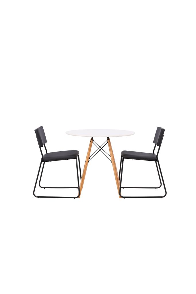 Elegant matgrupp med rund bordsskiva i vit MDF och två svarta stolar i modern design. Perfekt för små utrymmen.