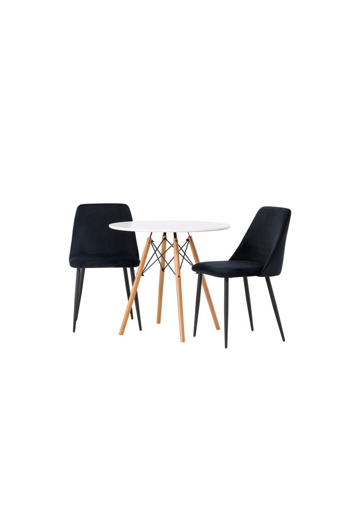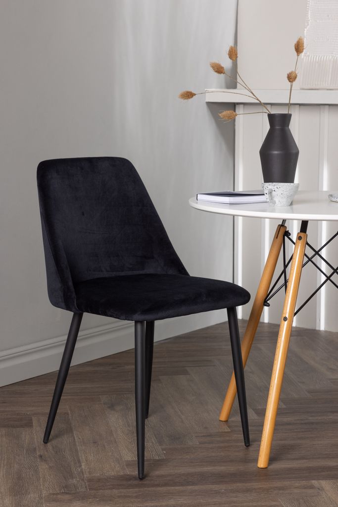 De medföljande Night-stolarna har en helklädd sits i svart sammetstyg, vilket ger en mjuk och lyxig känsla. De svarta benen förstärker den stilrena designen och erbjuder stabilitet och komfort.