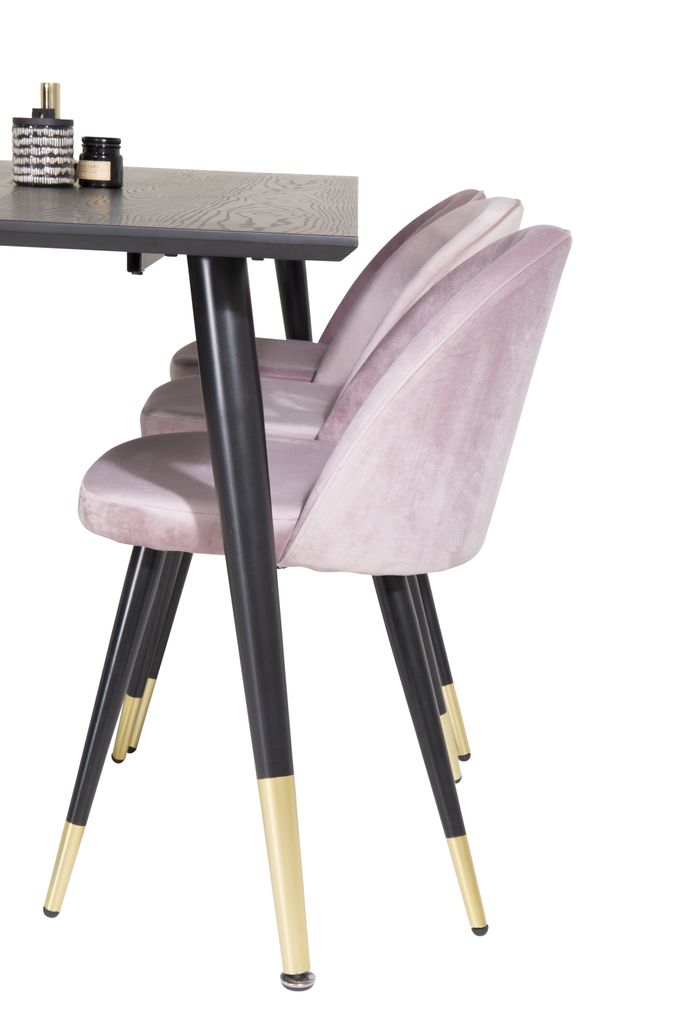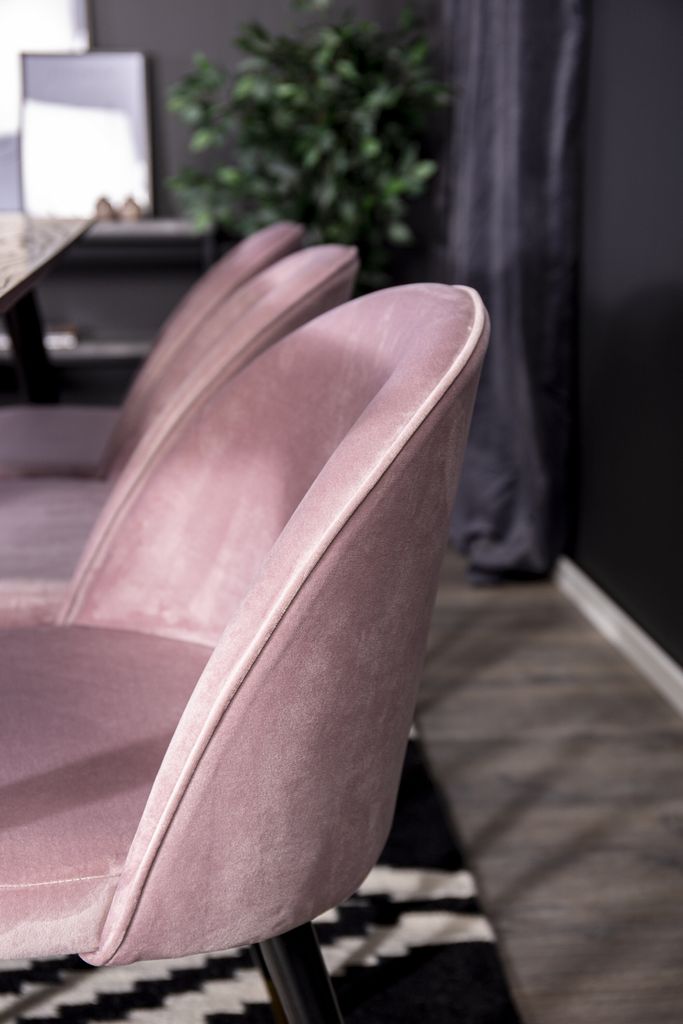 - Färger: Stolarna har en vacker rosa nyans som kontrasterar stilfullt mot bordets mörka finish.