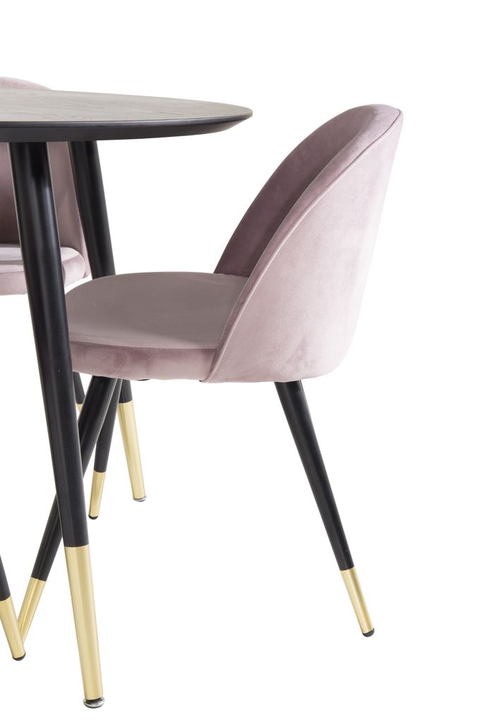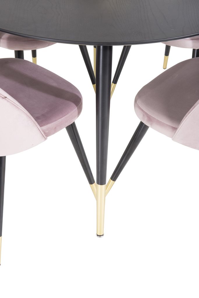 Matbordet Dipp har en elegant svart yta och ståtliga svarta ben som avslutas med en lyxig gulddetalj vid foten, vilket ger en modern touch. Stolarna i serien Velvet är klädda i mjuk, rosa sammet som ger en lyxig känsla och komfort. De svarta benen på stolarna matchar bordets design och är även de prydda med gulddetaljer.