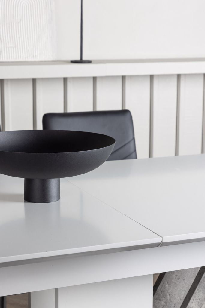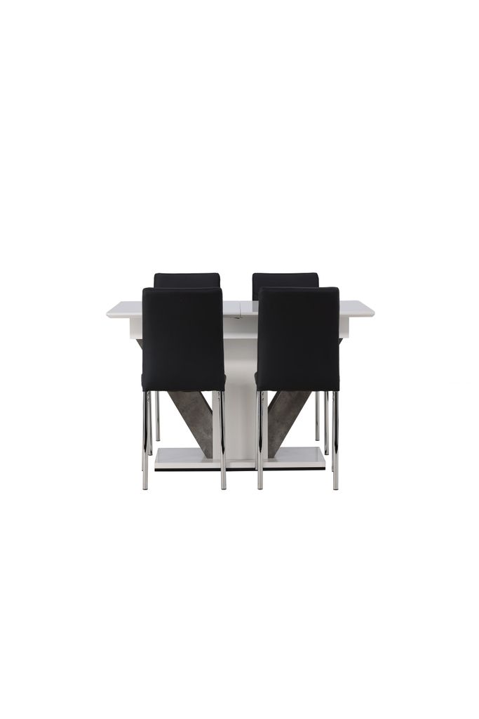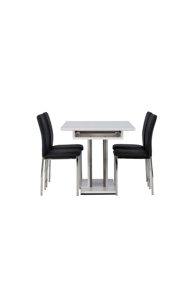 Stilren och tidlös matgrupp med förlängningsbart bord i vit MDF och svarta stolar i konstläder.