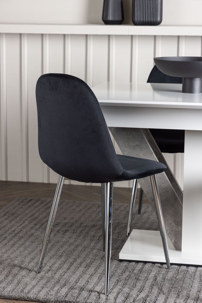 Tillsammans med de lyxiga Polar-stolarna, klädda i svart sammetstyg och med eleganta kromben, kompletterar denna matgrupp ditt hem. Den lätt rundade ryggen på stolarna ger extra komfort, vilket gör varje måltid till en härlig upplevelse.