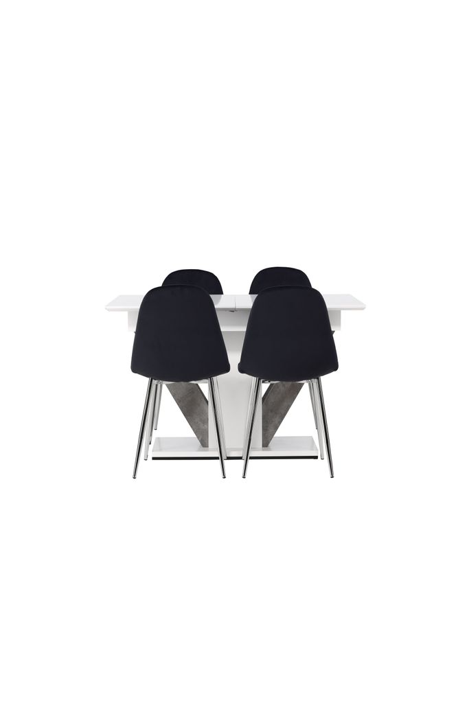Elegant och flexibel matgrupp med förlängningsbart bord i vit MDF och lyxiga svarta sammetsstolar.