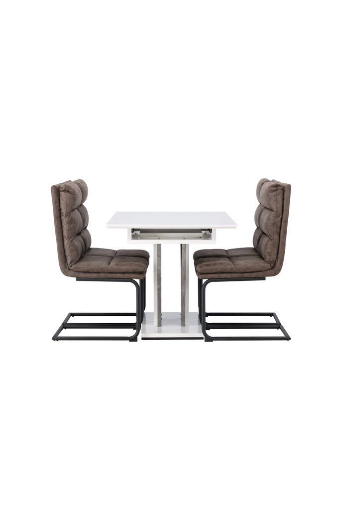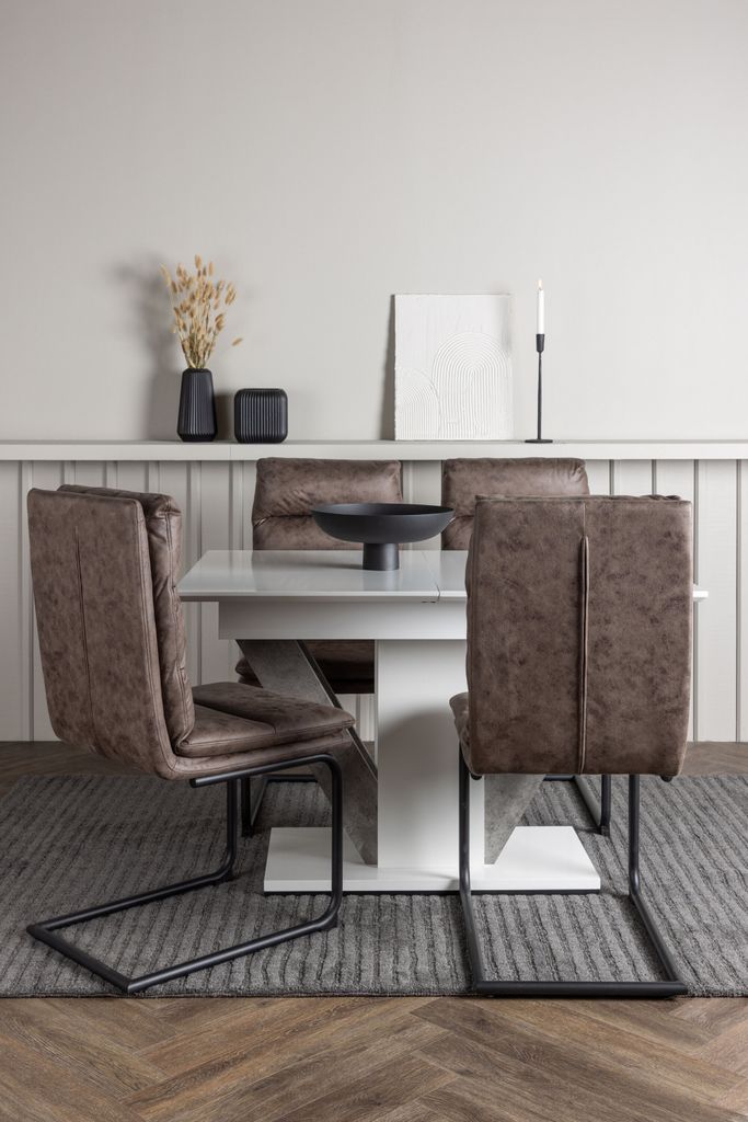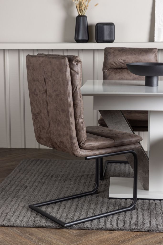De medföljande Zizo-stolarna, med deras nordiska design och rustika mörkbruna kulör, erbjuder en kombination av komfort och stil. Tillverkade av slitstark mikrofiber och med robusta järnben, är dessa stolar både hållbara och trendiga. Den stilfulla designen och den utmärkta sittkomforten gör dem till ett perfekt komplement till ditt matbord.