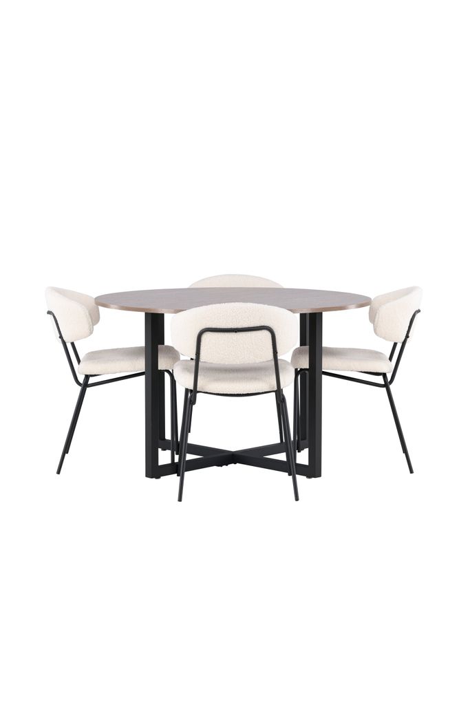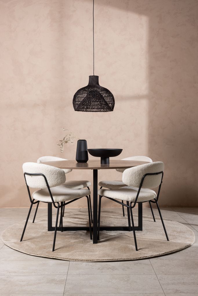 Tillsammans med fyra matstolar från serien Chico, som erbjuder en härlig kombination av komfort och stil. Stolarna är klädda i mjukt vitt boucletyg och har en välstoppad sits och ryggstöd, vilket ger en skön sittupplevelse. De smala, svarta stålbenen ger stolarna en lätt och luftig känsla, vilket kompletterar bordets moderna design.