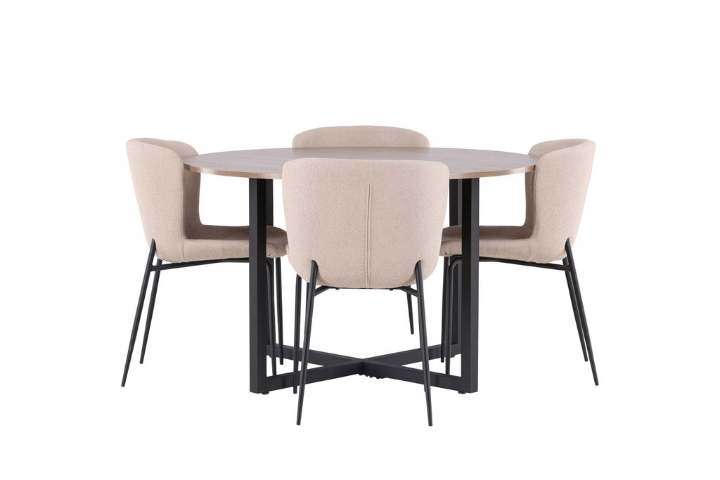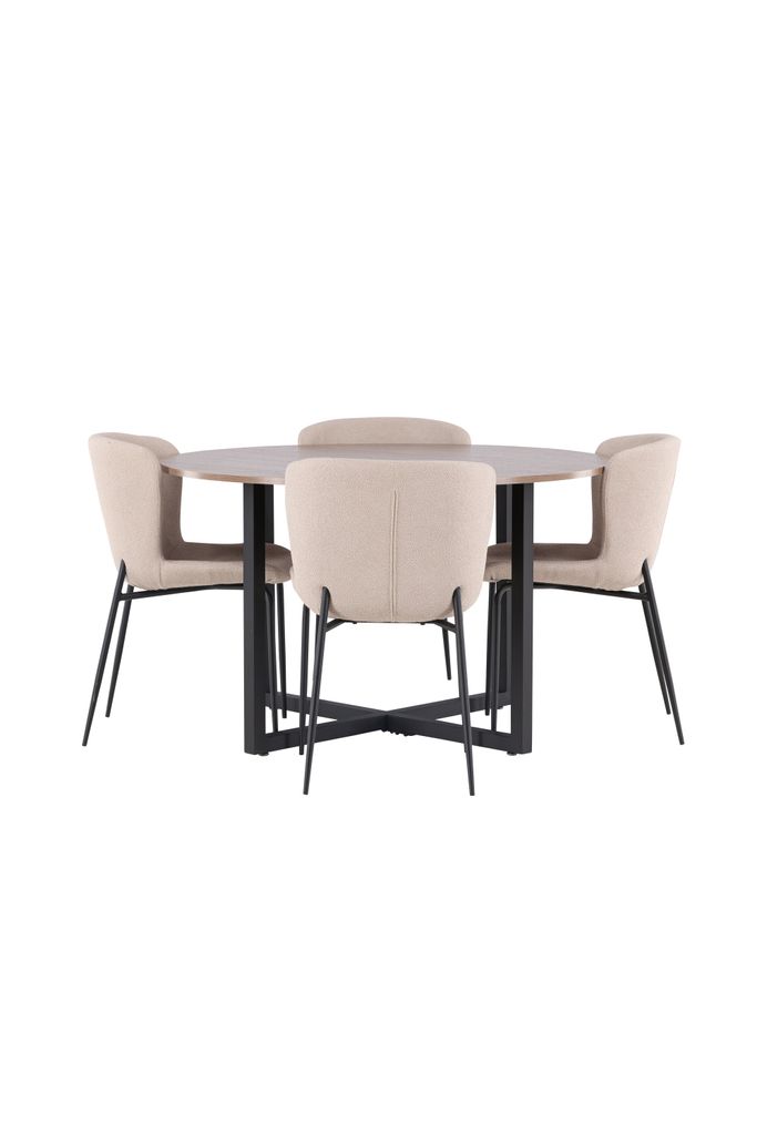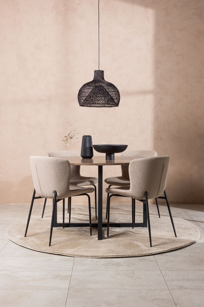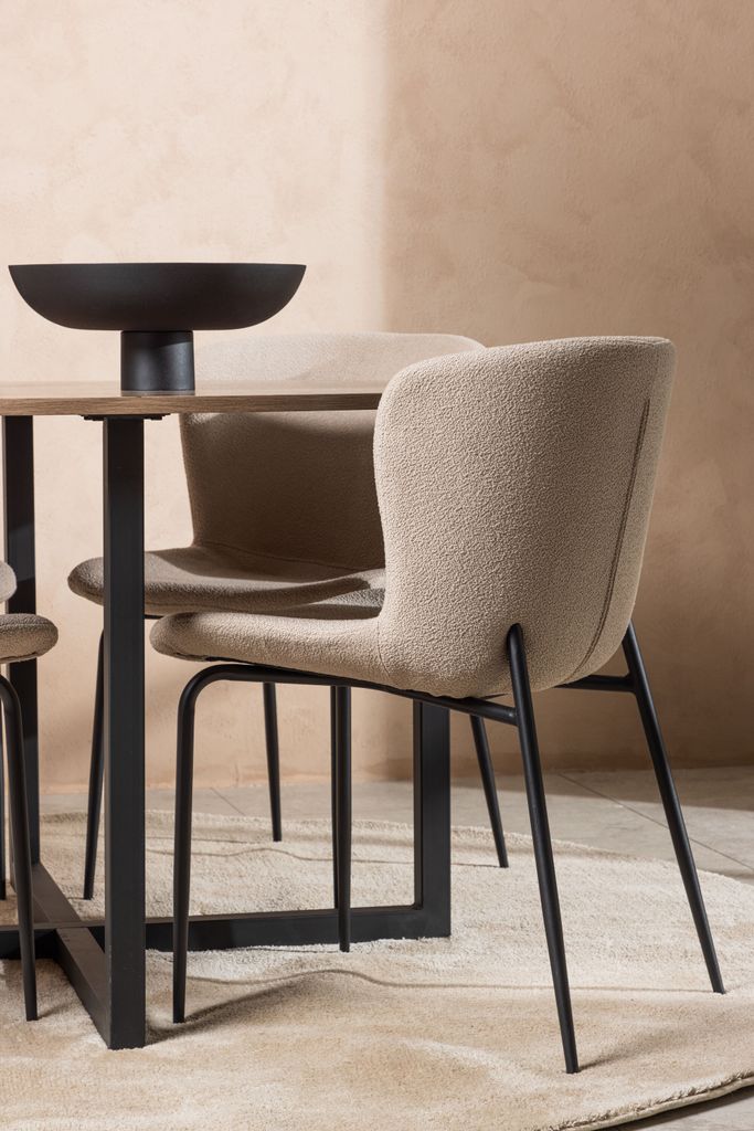 Tillsammans med bordet kommer fyra Modesto matstolar, klädda i beige lurvigt tyg som förhöjer både komfort och estetik. Stolarna har smala, stilrena ben i svart metall, och deras lätt rundade ryggstöd och stoppade sittdynor säkerställer en behaglig sittupplevelse under långvariga måltider.