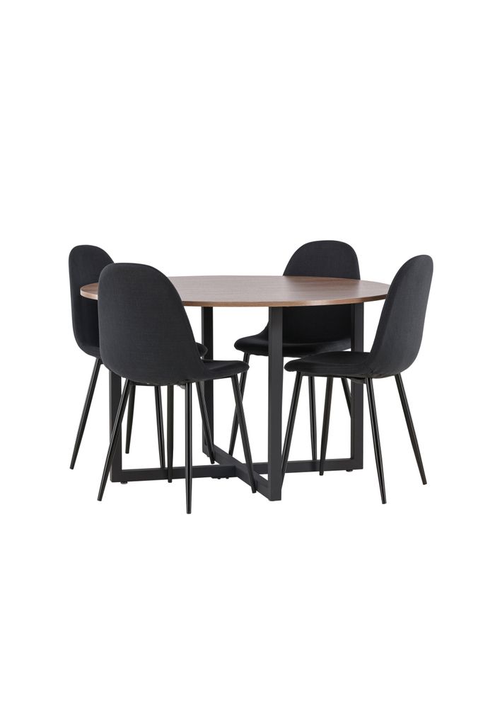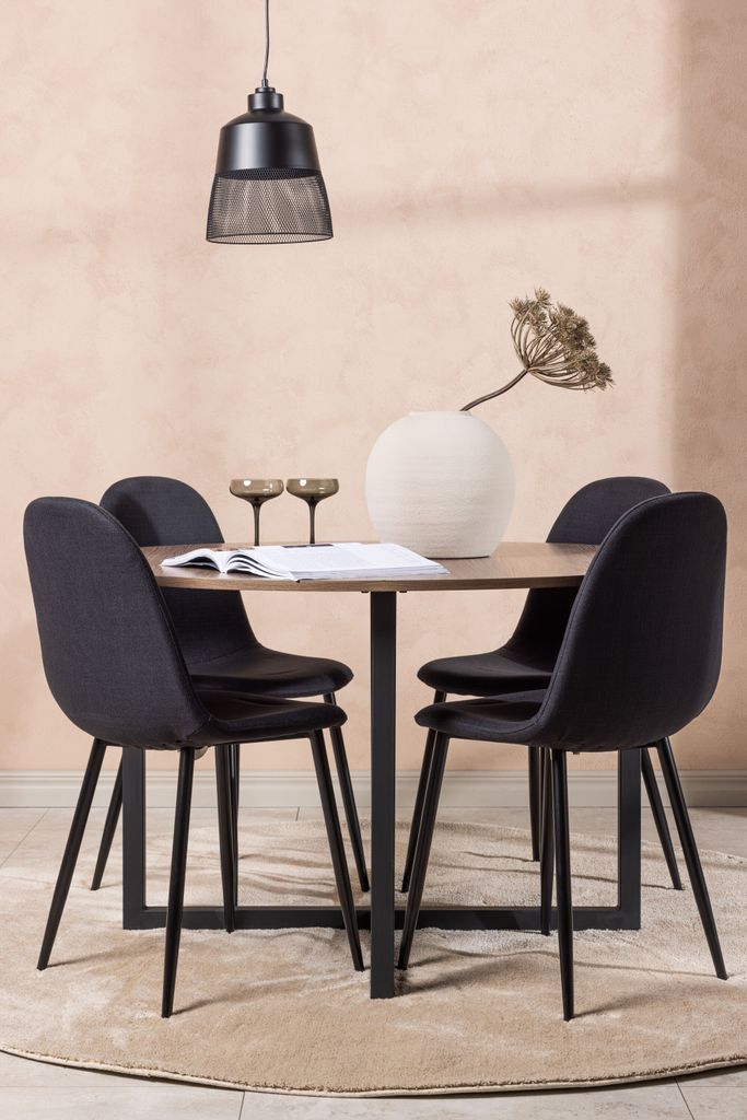 Skapa en elegant och inbjudande matplats med Venture Home Matgrupp Durango. Denna stilfulla grupp kombinerar en rund valnötsfärgad bordsskiva i MDF med robusta, svarta stålben som bildar ett iögonfallande kryssmönster på golvet. Matstolarna, från serien Polar, har en rundad design med stoppad rygg och sits i svart polyestertyg, vilket ger både komfort och stil. Stolarna kompletteras av svarta ben i pulverlackerad metall, vilket skapar en modern och tidlös känsla. Bordets diameter på 120 cm ger gott om utrymme för fyra personer att sitta bekvämt. Denna matgrupp är perfekt för dig som söker en kombination av funktionalitet och design.