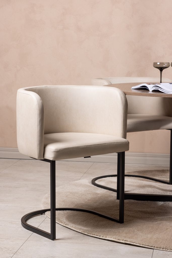 De fyra Simrishamn stolarna har en helklädd sits i beige TC-tyg och ett rundat ryggstöd för ultimat komfort. Stolarnas minimalistiska stålben kompletterar bordets design och skapar ett enhetligt och sofistikerat utseende.