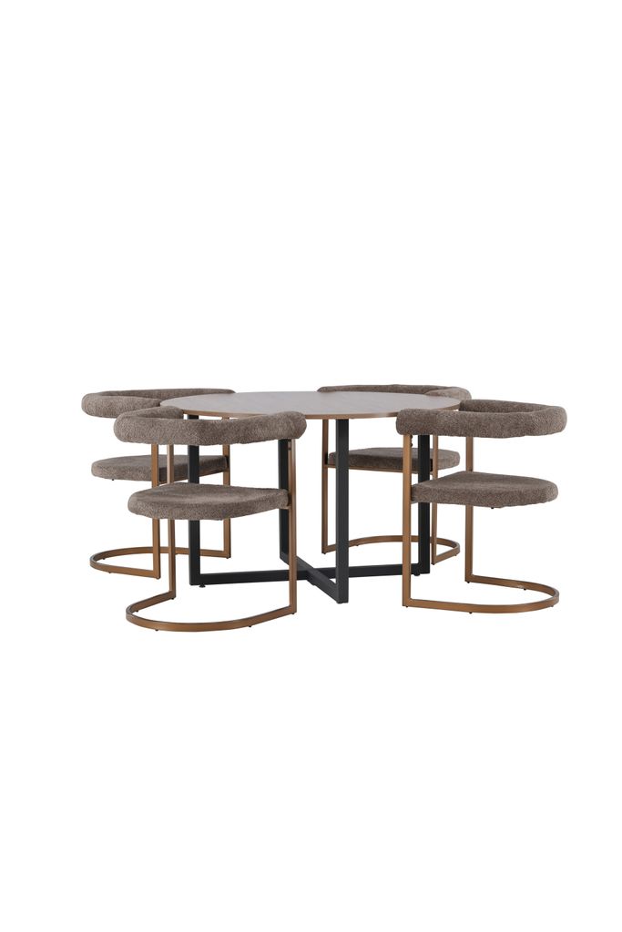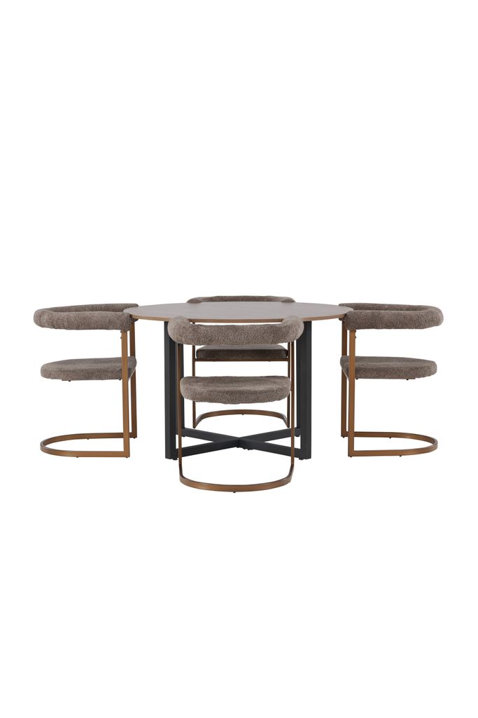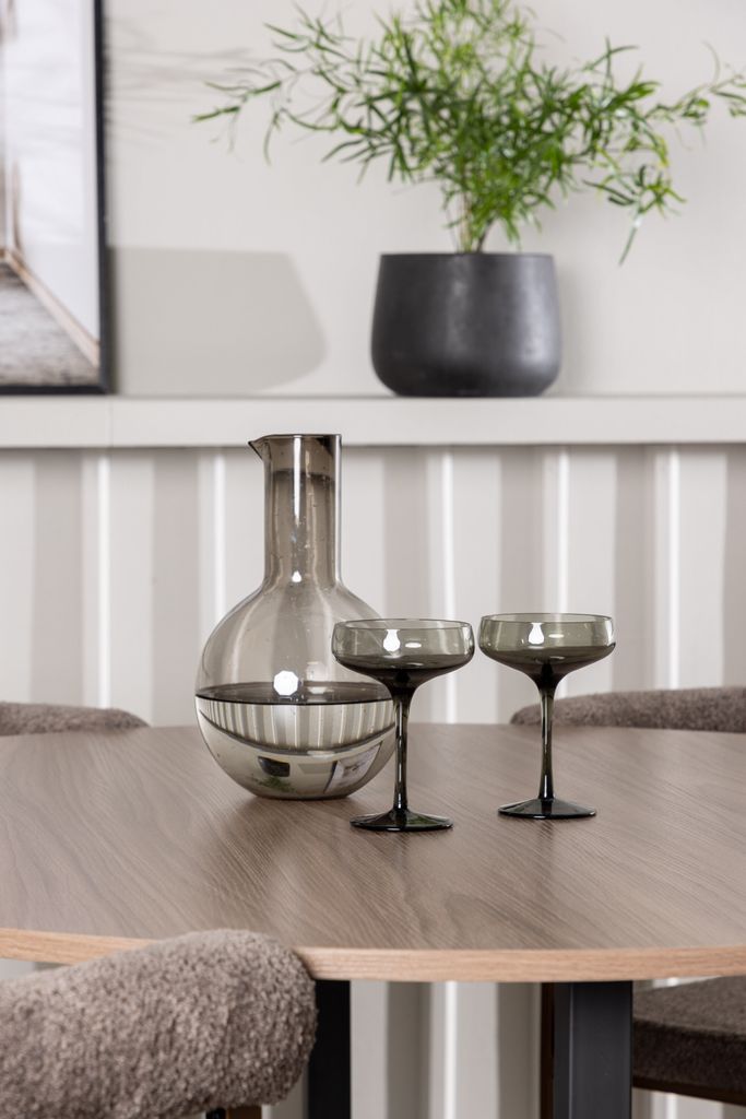 Bordet är utrustat med en vacker valnötsfärgad bordsskiva tillverkad i MDF, vilket ger en varm och exklusiv känsla. Dess generösa diameter på 120 cm gör bordet idealiskt för att samla familj och vänner. Under bordsskivan stödjs den av moderna, svarta stålben som bildar ett elegant kryss, vilket ger en sofistikerad kontrast till den tidlösa designen.