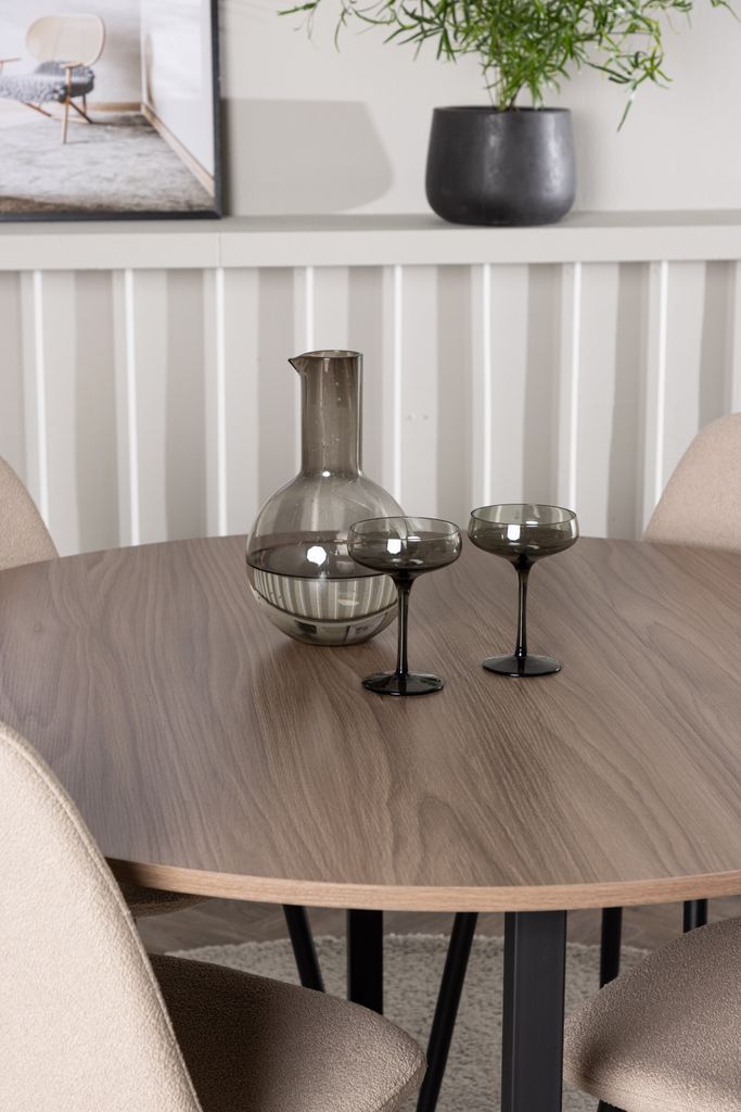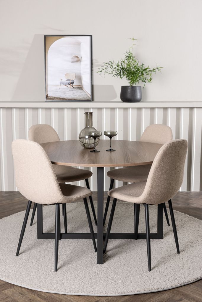 Skapa en inbjudande atmosfär i ditt hem med Venture Home Matgrupp Durango, där elegans möter funktion. Denna matgrupp består av ett runt bord med en lyxig valnötsfärgad MDF-skiva som mäter 120 cm i diameter, vilket ger gott om plats för trevliga middagar. Bordets ben är tillverkade i svart stål och skapar ett elegant korsmönster som inte bara är stilrent, utan också ger fantastisk stabilitet.