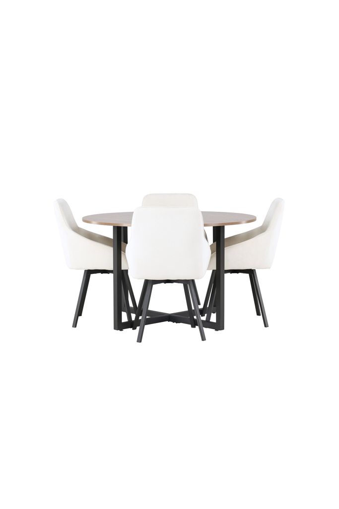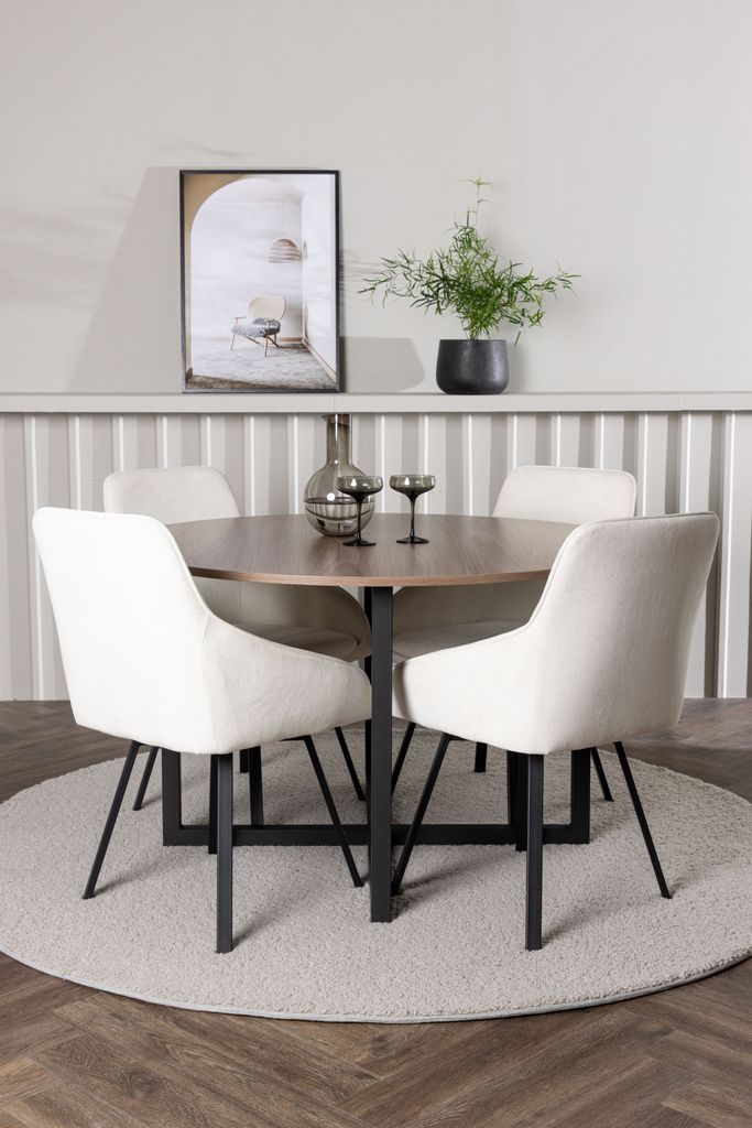 Det runda bordet har en valnötsfärgad bordsskiva i MDF som ger en varm och inbjudande känsla. De svarta stålbenen bildar ett elegant kryssmönster, vilket inte bara ger stabilitet utan också en modern touch. Bordets mått är 120 cm i diameter, vilket ger gott om plats för trevliga middagar.