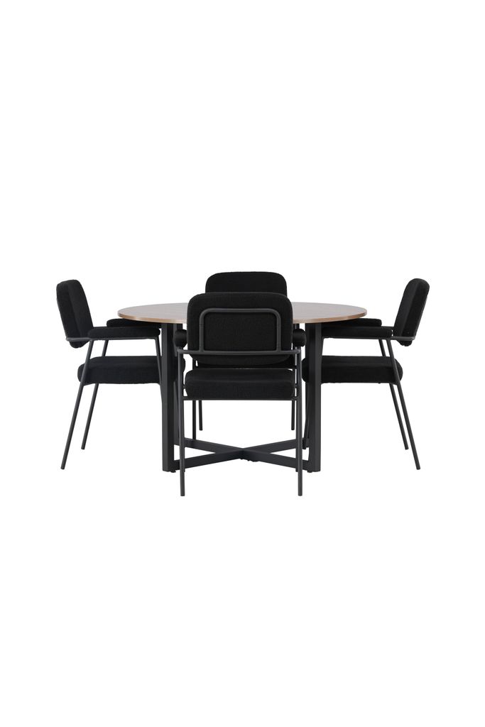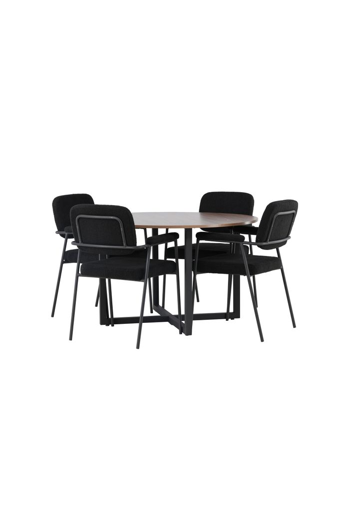 Elegant matgrupp med valnötsfärgad bordsskiva och bekväma svarta bouclétyg-stolar.