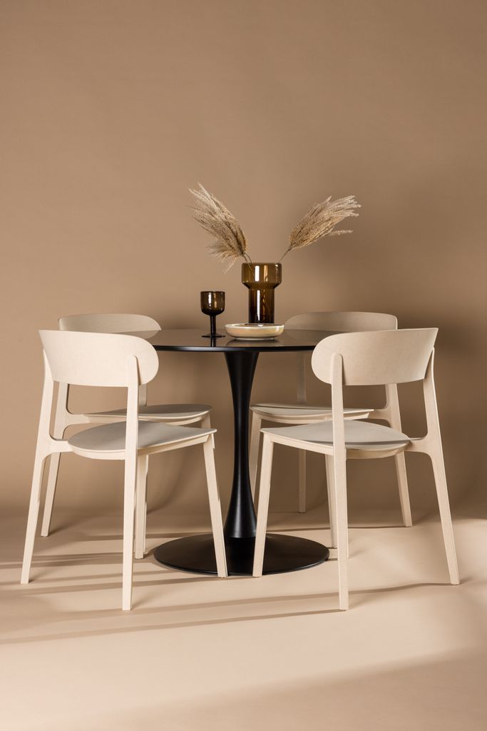De medföljande Åstol-stolarna har en luftig design och är tillverkade av träkomposit i en ljusputsad kulör, vilket skapar en harmonisk och inbjudande atmosfär runt bordet. De raka, nordiska formerna på stolarna kompletterar det moderna uttrycket av matgruppen.