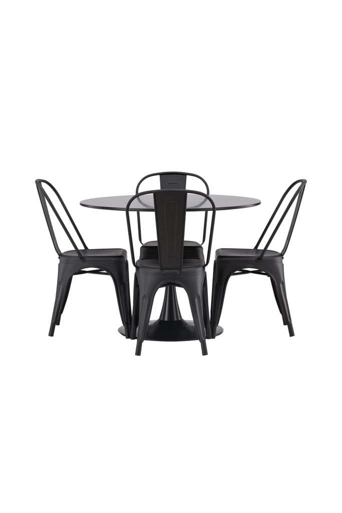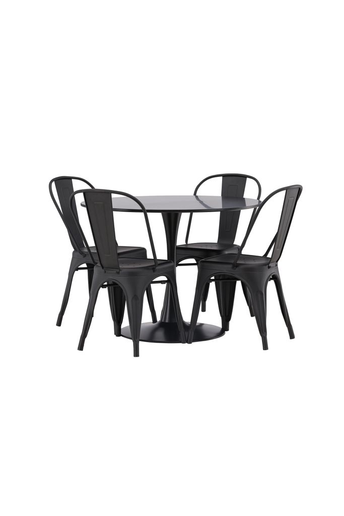 Elegant svart matgrupp med Glade bord och Tempe stolar i hållbar metall och MDF, perfekt för stilrena hem.