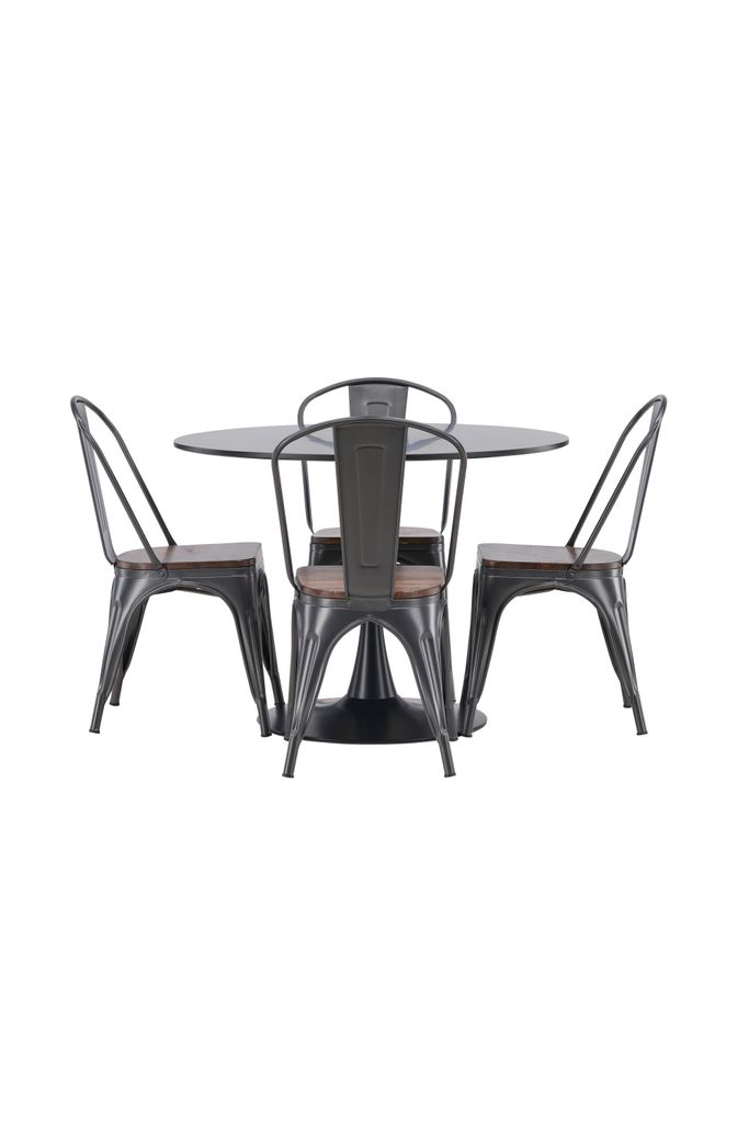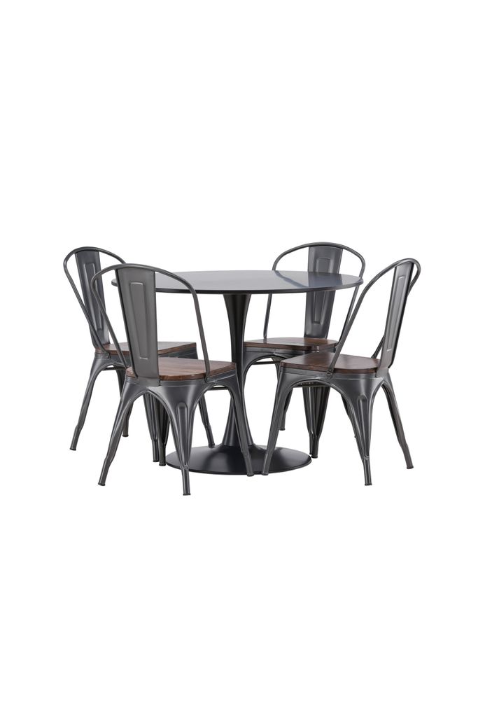 Trendsäker matgrupp med svart stål och mörkt trä. Skandinavisk design för stil och komfort i ditt hem.