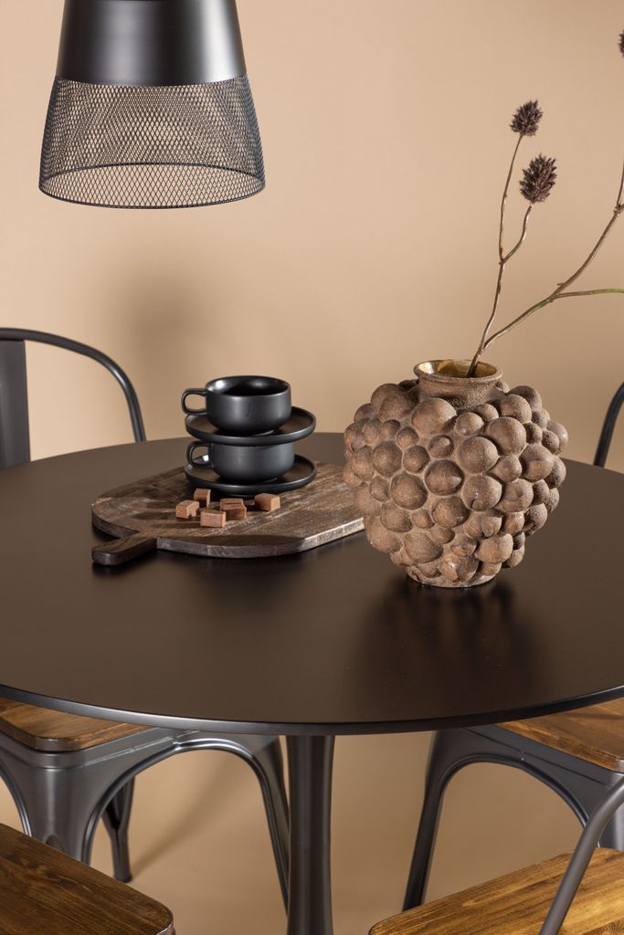 Det runda Glade matbordet har en slät svart bordsskiva av MDF som vilar på en smäcker trumpetfot i svart stål, vilket ger ett modernt och minimalistiskt utseende. Bordets diameter är 100 cm, perfekt för mindre utrymmen.