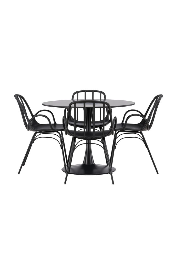 Skapa en stilren atmosfär med Glade matbord och Dyrön stolar i svart design. Perfekt för det moderna hemmet.
