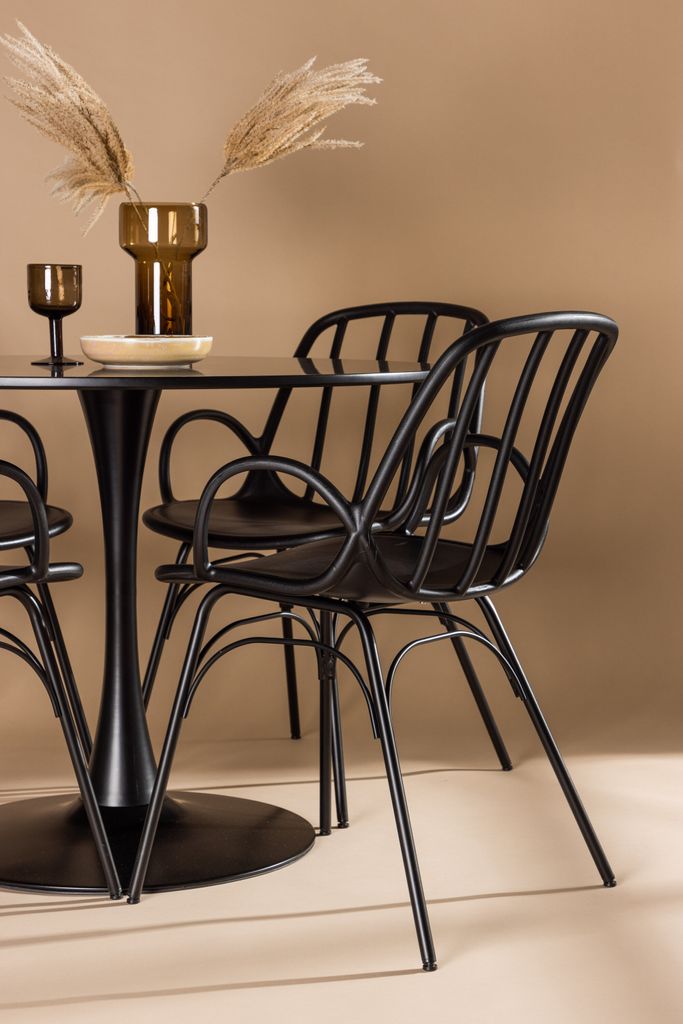 De medföljande Dyrön stolarna erbjuder både komfort och design. Tillverkade i svart plast och stål, har dessa stolar en ribbad design med integrerade armstöd och en lätt rundad rygg som omfamnar kroppen för maximal komfort. De smala, lätt utsvängda benen i svart stål förhöjer den skandinaviska designkänslan.