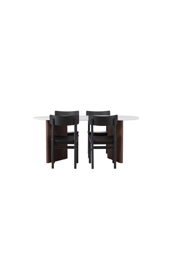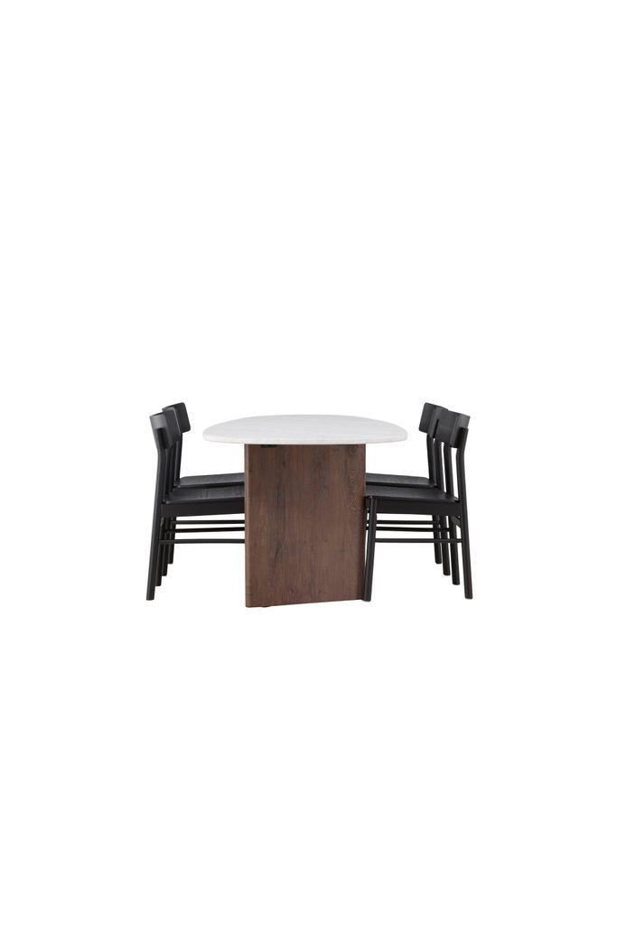 Upptäck Venture Home Matgrupp Grönvik med stolar från serien Montros, en perfekt kombination av stil och funktionalitet. Den ovala bordsskivan i ljusgrå MDF med en elegant marmor-look ger en distinkt och modern känsla, medan de två tunna, mörkbruna träskivorna utgör en stabil och estetiskt tilltalande stomme. Bordet mäter 180x75 cm och erbjuder gott om plats för familj och vänner.