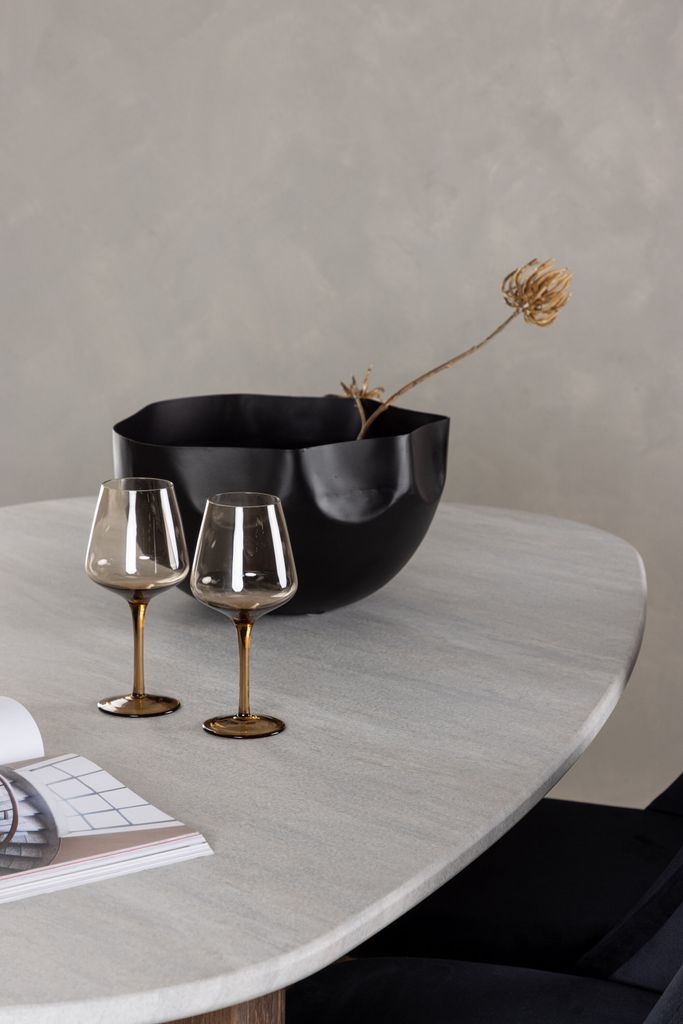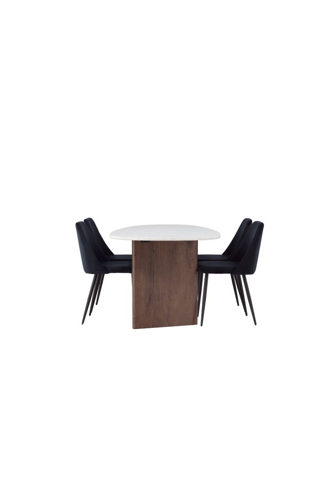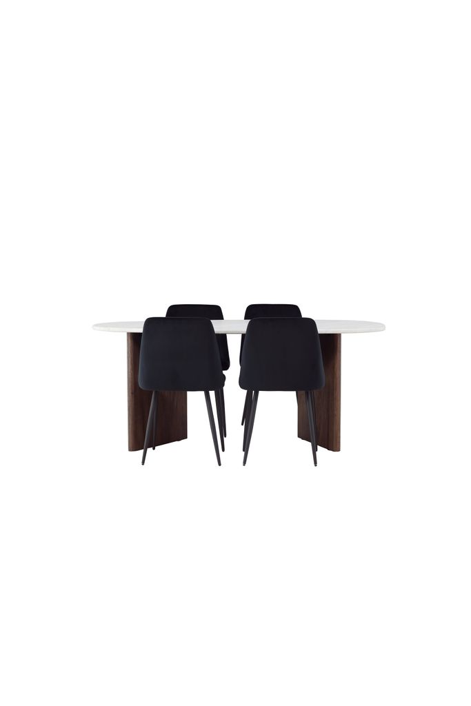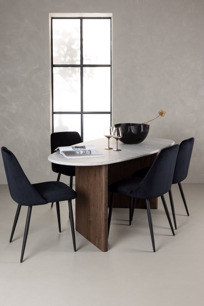 Runt bordet tronar de eleganta Night-stolarna, klädda i svart sammetstyg som utstrålar lyx och exklusivitet. De svarta stolsbenen kompletterar den helklädda sitsens sofistikerade framtoning, vilket gör varje måltid till en fest. Den här matgruppen är designad för att passa både formella och informella sammankomster, vilket gör ditt hem inbjudande och modernt.
