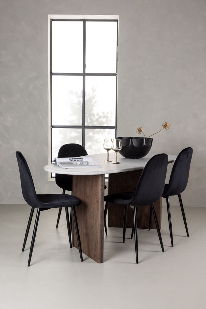 De svarta Polar stolarna är helklädda i mjukt sammetstyg som erbjuder både stil och komfort. Stolarna har en robust design med klassiska ben i svart pulverlackerad metall. Den generösa stoppningen gör att du kan njuta av långa, bekväma middagar.