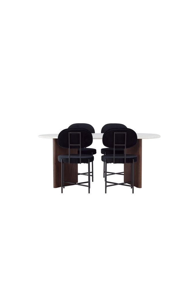 Bordets generösa mått på 180x75 cm gör det perfekt för både vardagliga måltider och festliga tillfällen. Tillsammans med Stella-stolarna i lyxigt svart sammetstyg, får du en trendig och bekväm sittupplevelse. Stolarna har en rund sits och en elegant stolsrygg, medan de svarta stålbenen bidrar till ett modernt och stilrent uttryck.