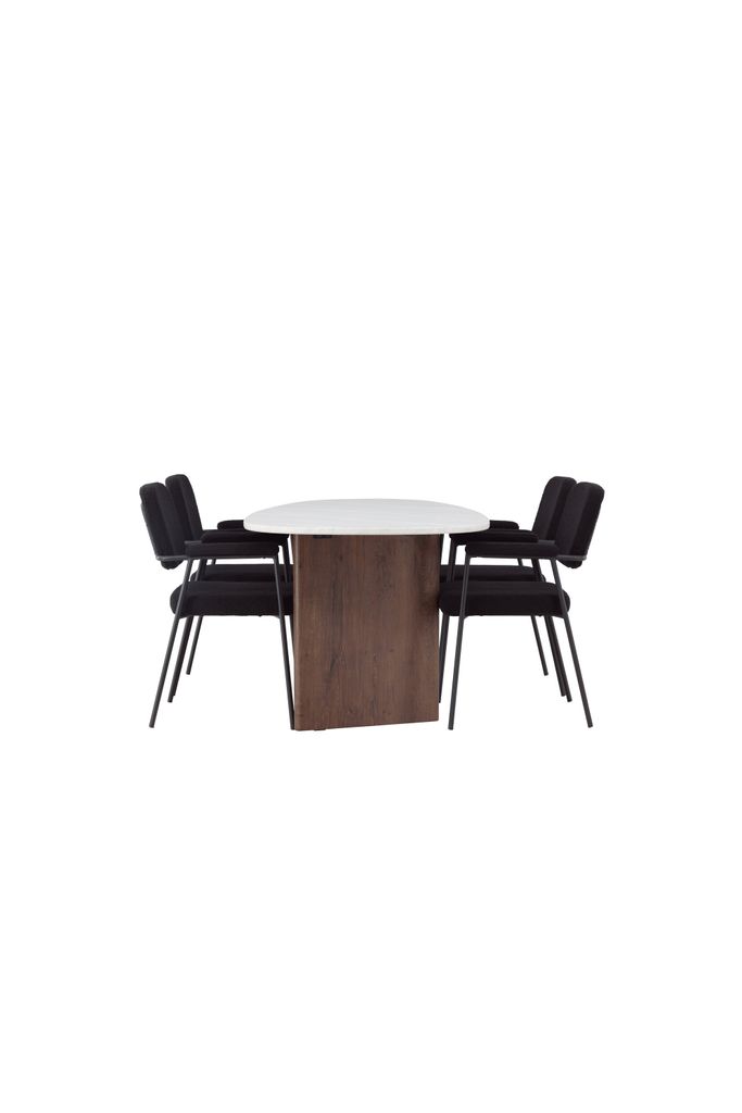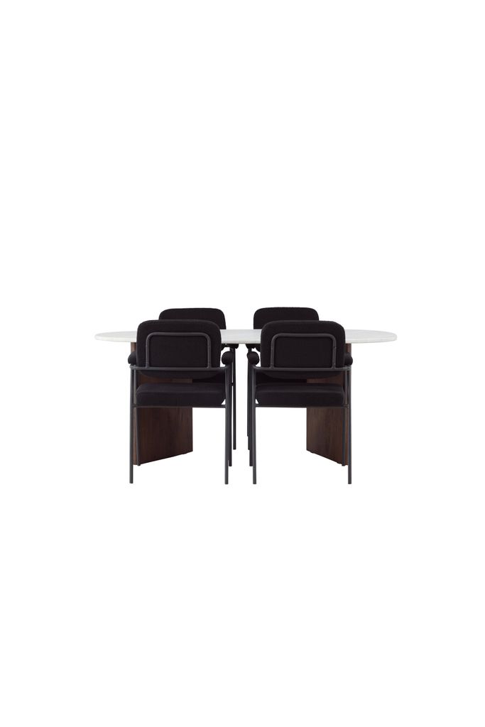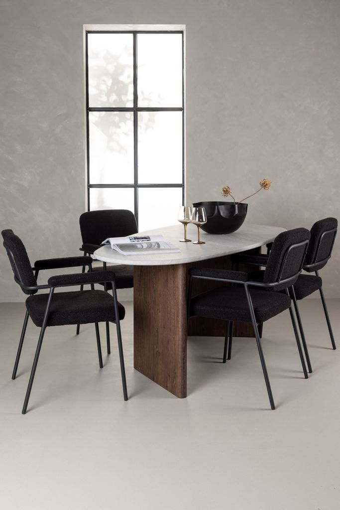 Komplettera med våra Yesterday-stolar, klädda i lyxigt svart bouclétyg. Stolarna har smala, eleganta ben i svart metall med integrerade armstöd, vilket ger både stil och komfort. De mjukt stoppade sitsarna inbjuder till långa, trivsamma middagsstunder där familj och vänner kan samlas för att skapa oförglömliga minnen.