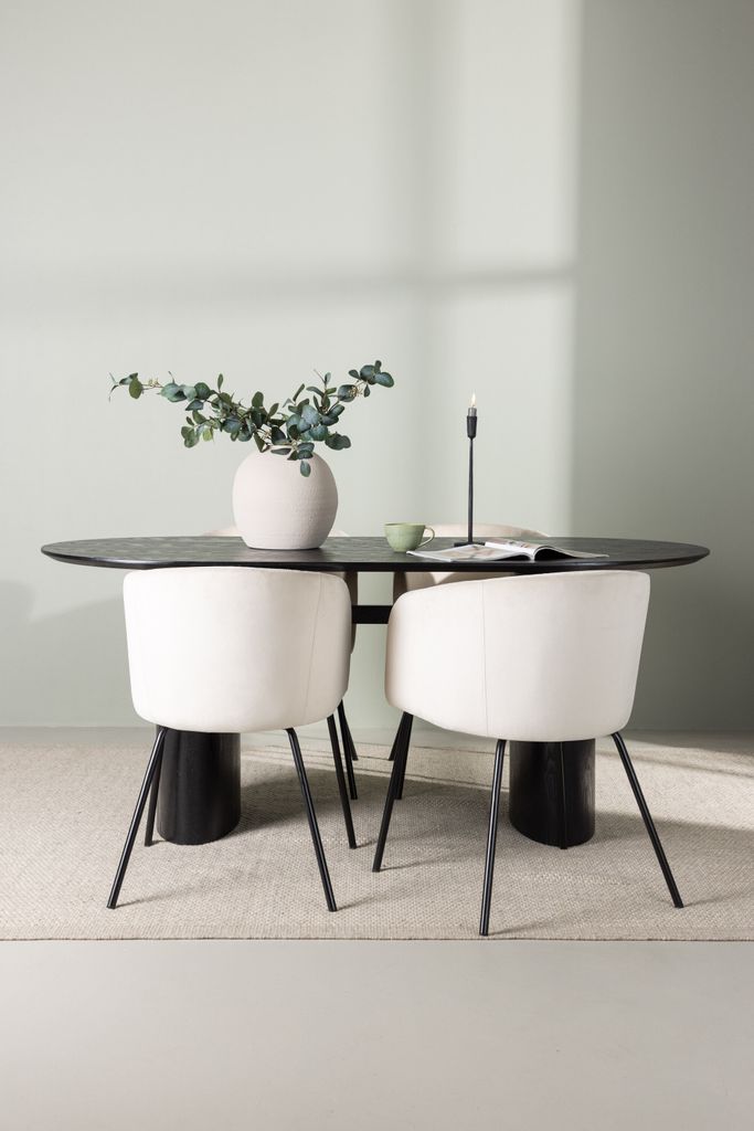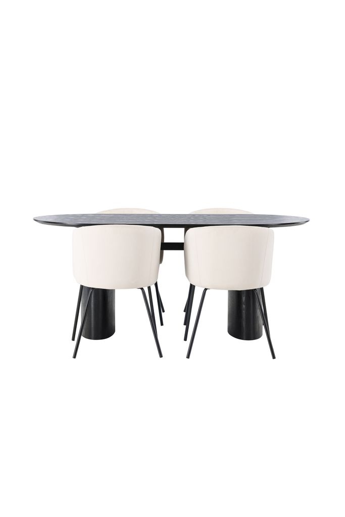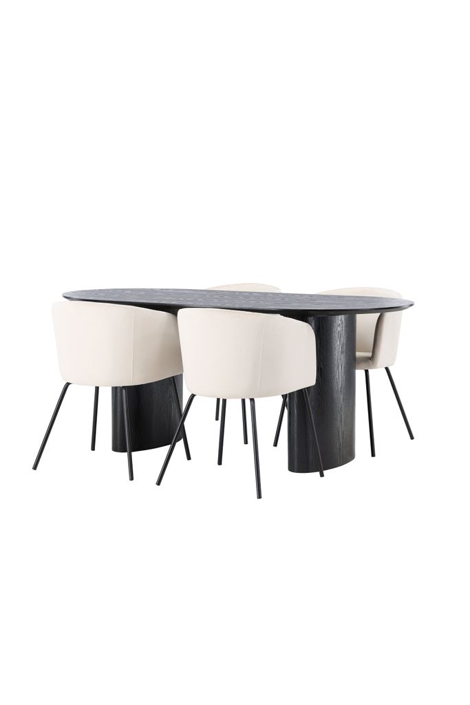 Elegant matgrupp med oval bordskiva i svart MDF och bekväma, helklädda stolar i beige sammet.