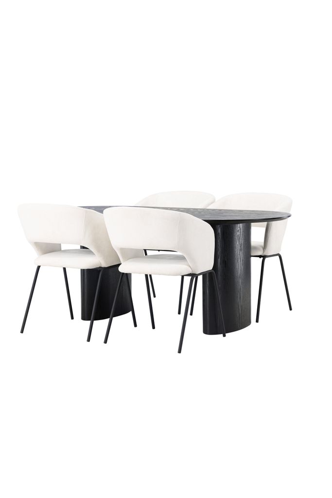 Venture Home Matgrupp Isolde med stolarna Day är en stilfull och modern lösning för ditt matrum. Det ovala matbordet i svart MDF har en robust stomme som ger ett stadigt och lyxigt intryck. Den ovala bordsskivan erbjuder gott om plats, vilket gör det idealiskt för familjemiddagar eller sociala tillställningar. Bordet mäter 180x75 cm, vilket ger en perfekt balans mellan funktionalitet och estetik.