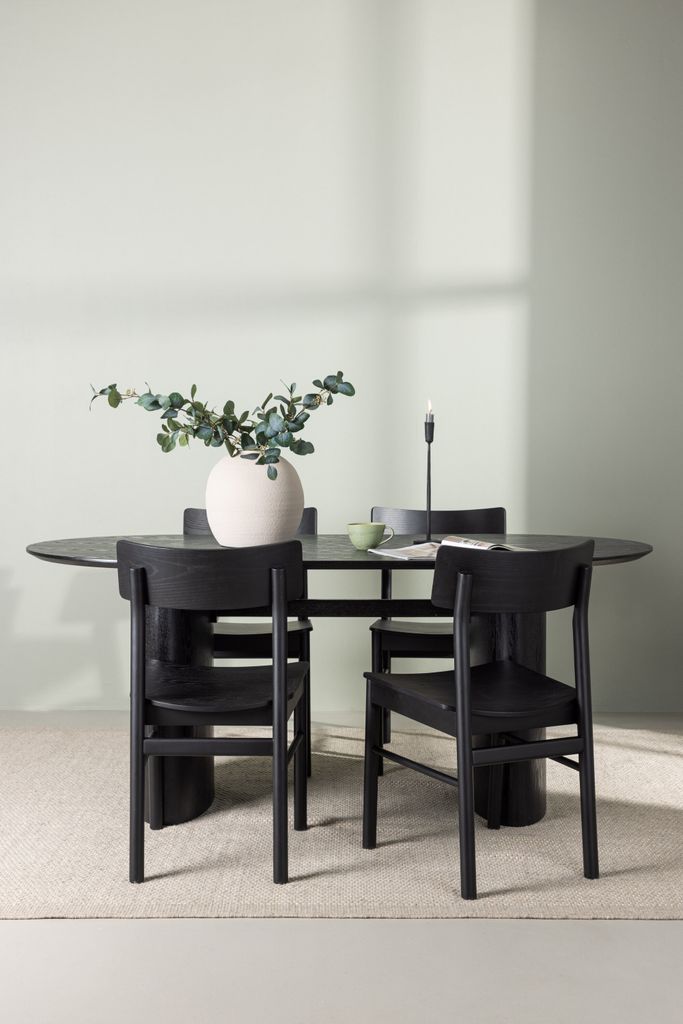 Stommen är kraftfull och ger ett stadigt intryck samtidigt som den levande texturen i materialet tillför en visuell rörelse. Bordet kommer med matchande Montros stolar, som har en klassisk skandinavisk design med raka linjer. Tillverkade av svart gummiträ, dessa stolar kombinerar nostalgi med modernitet.